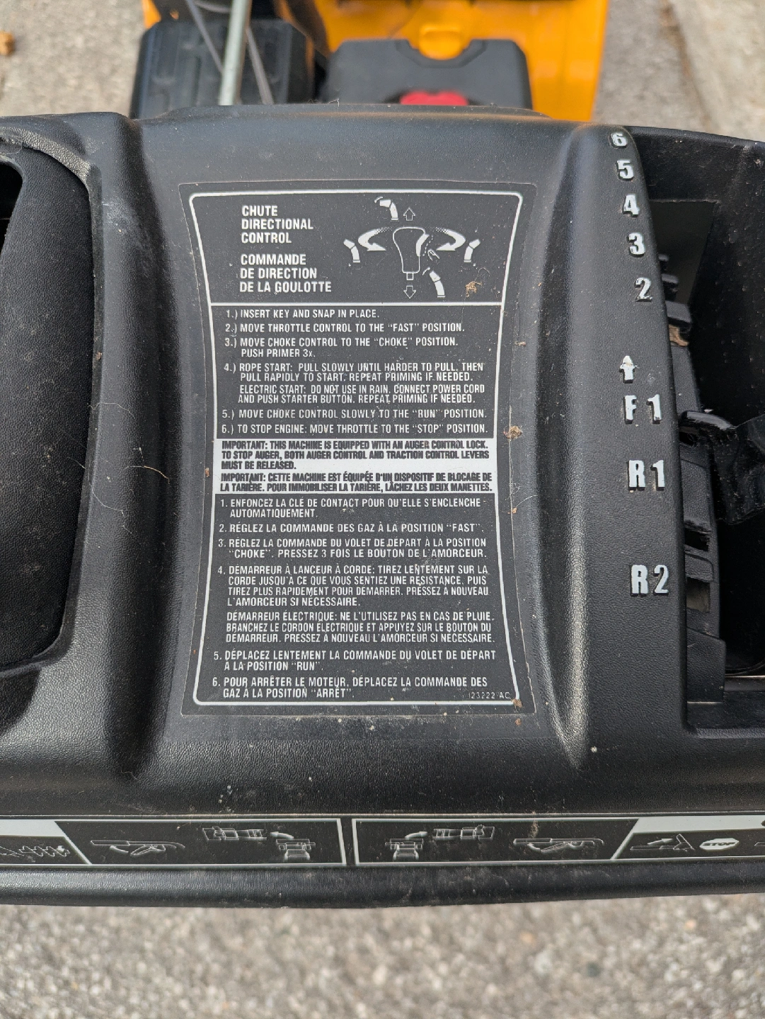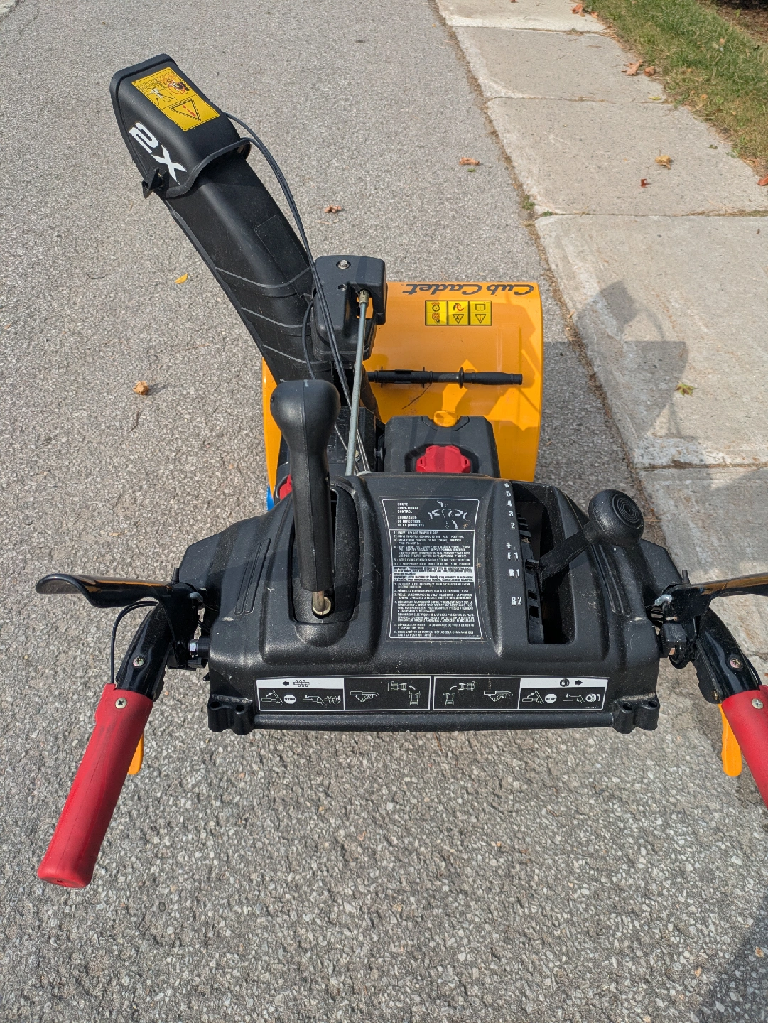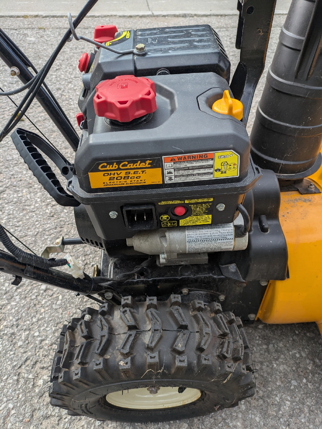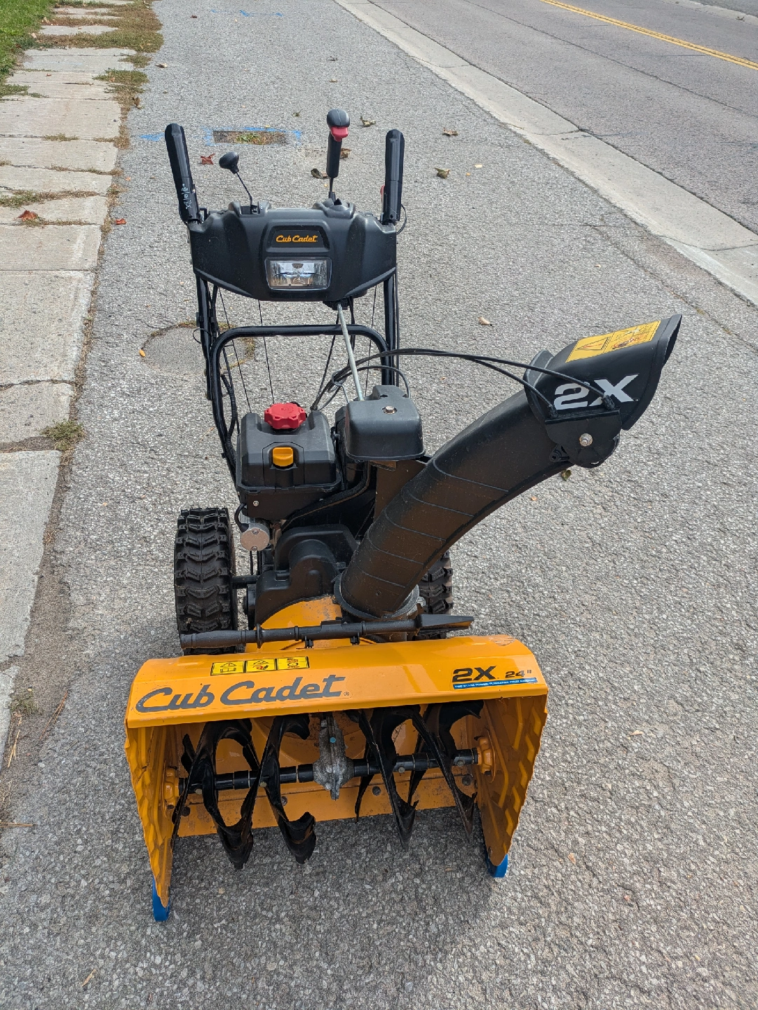 Like new 24-inch 208cc Two-Stage Gas Snow Blower with Electric Start built in head lamp for low light conditions Power steering allows you to turn with the touch of a finger 4-way joystick control allows you to change pitch and direction of snow discharge easily and quickly Self-propelled with choice of 6 forward and 2 reverse speeds Located in East York