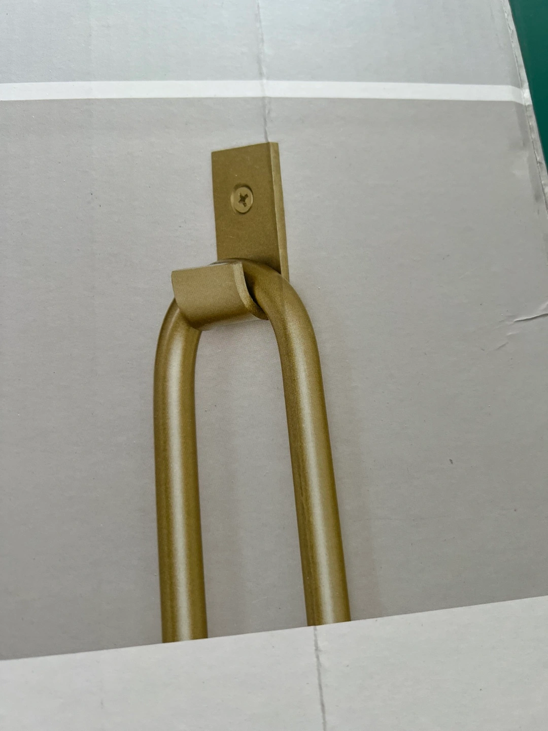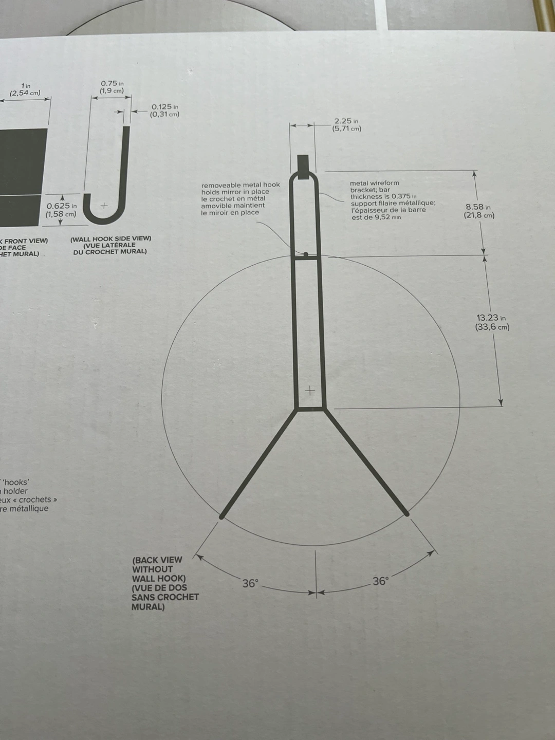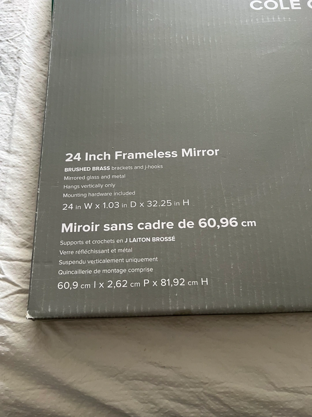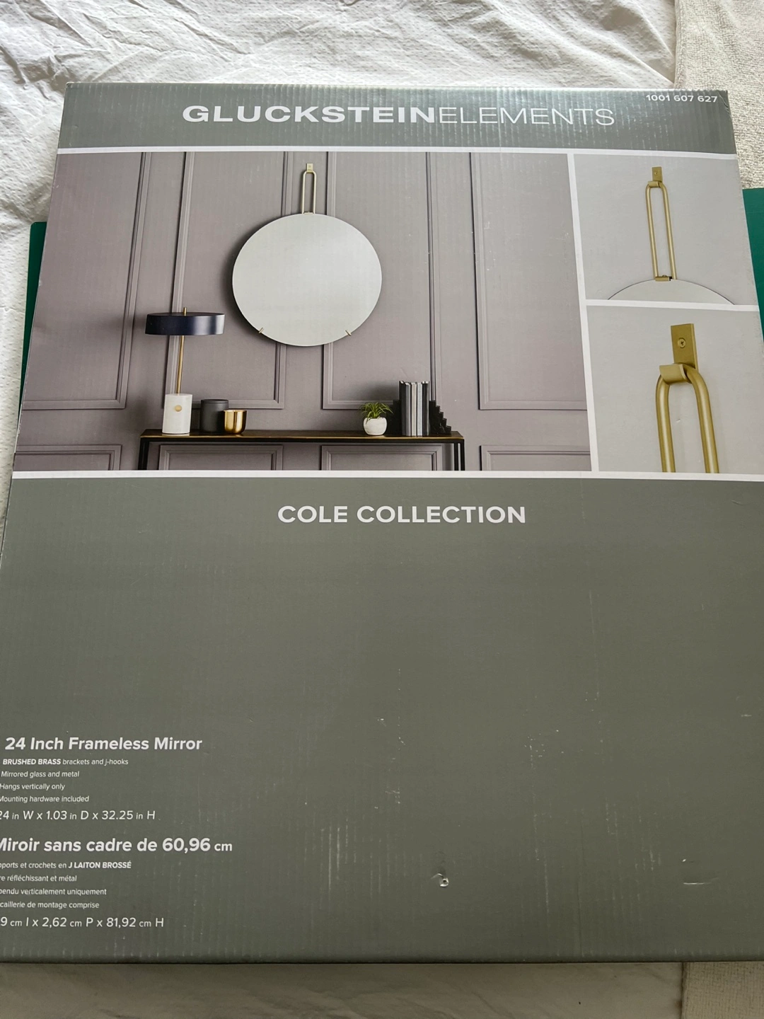 Round mirror, brushed brass brackets and J-hooks. Hangs vertically. Mounting hardware included. New, opened box just to take picture. Bought and never used - paid 99.00 plus taxes - selling for 50 Fashionable brushed brass hardware and frameless mirror