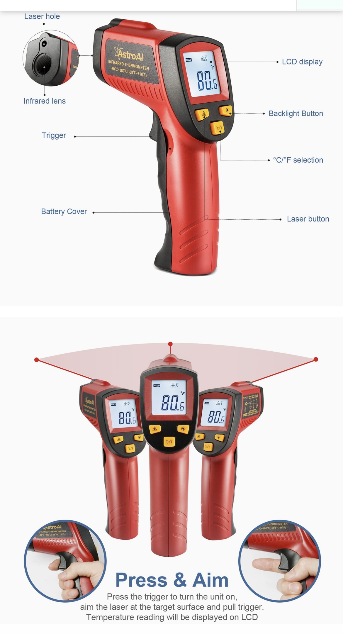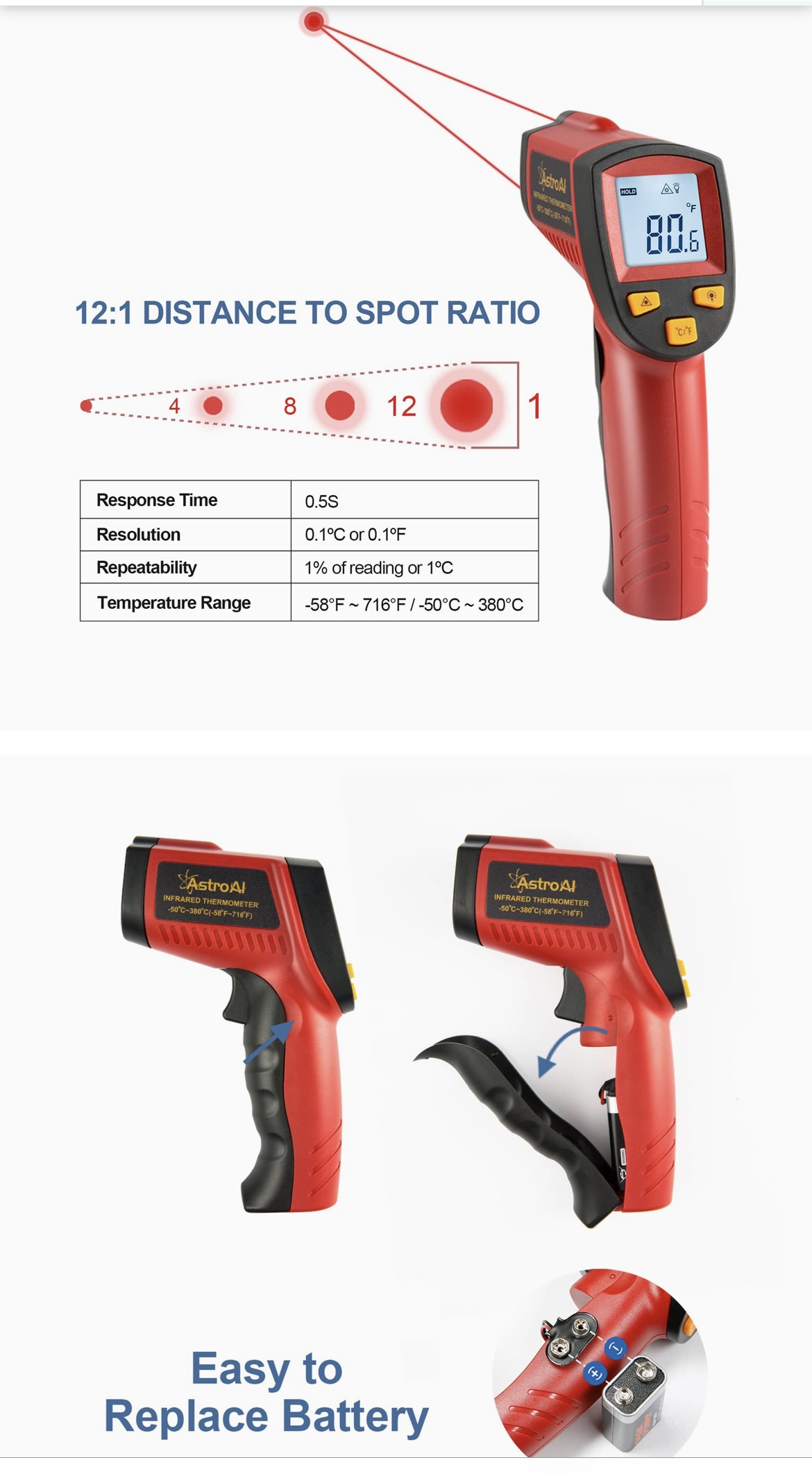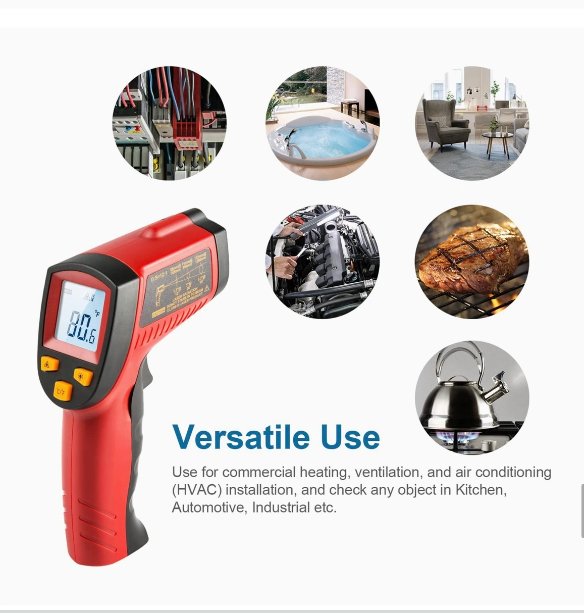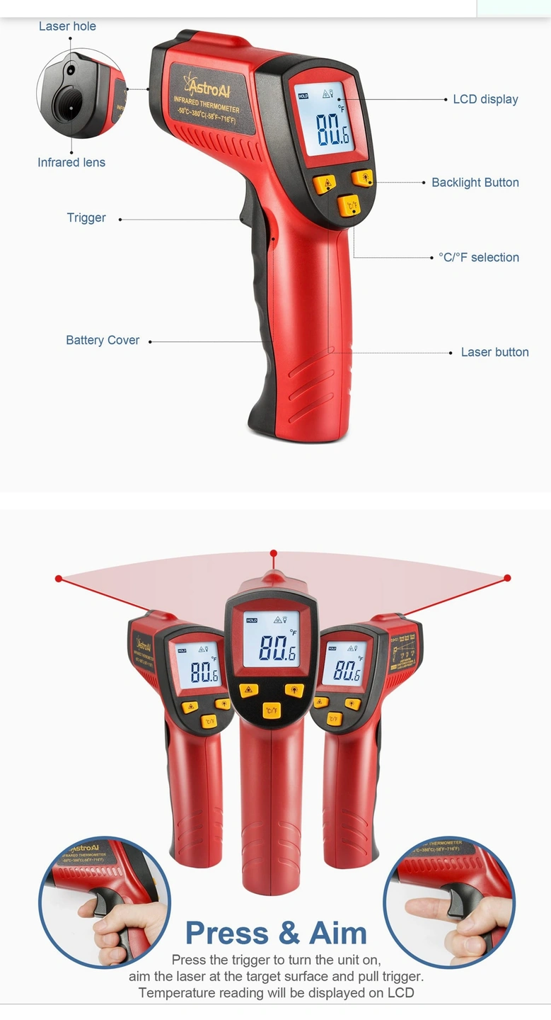 ****MSG FOR VIDEO OF IT WORKING**** USES •Utilize this infrared thermometer gun as a Cooking Food thermometer, BBQ, Meat thermometer, Pool thermometer, Pizza Oven thermometer, Oil thermometer, Automotive thermometer, and more. •A built in Laser gives you the precision to spot on the exact space you want to measure. •White backlight is brighter than other colors; Large Backlit LCD display for visibility in dimly light areas. •Automatically shuts off in 7 seconds to save the power and features a low battery indicator so you never accidentally run out of juice. VERSATILE DESIGN •This Infrared thermometer with innovative Technology can be used for both daily and industrial temperature measurements, such as cooking, performing auto/motor maintenance, barbequing, refrigeration, steel, home/commercial repairs, commercial heating, air conditioning, and so on. It is the ideal gift for women providing a better-assisted living every day. INCREASED FUNCTIONS •It is easier to use with upgraded designs like a Data Hold, LCD Backlit Screen, and Easy Fahrenheit/Celsius Switch. LCD backlight helps you view the temperatures even in the dark. Battery saving 7-second auto-off so it won't drain your battery even if you forget to turn it off. HIGH ACCURACY •The distance-to-spot ratio is 12: 1, meaning it can accurately measure temperatures from greater distances compared to most other Thermometers. Combining the advanced technology, this instrument reads values of high accuracy up to ±1% in only 0.9s. Other data related: Resolution: 0.1℃ or 0.1℉, Response Time:0.5s. TARGET QUICKER •An integrated laser assists in better locating and getting the temperature within 0.5s. It can measure surface temperature ranging from -58℉~716℉ / -50℃~380℃, temperature unit changed through the ℃/℉ selection button.