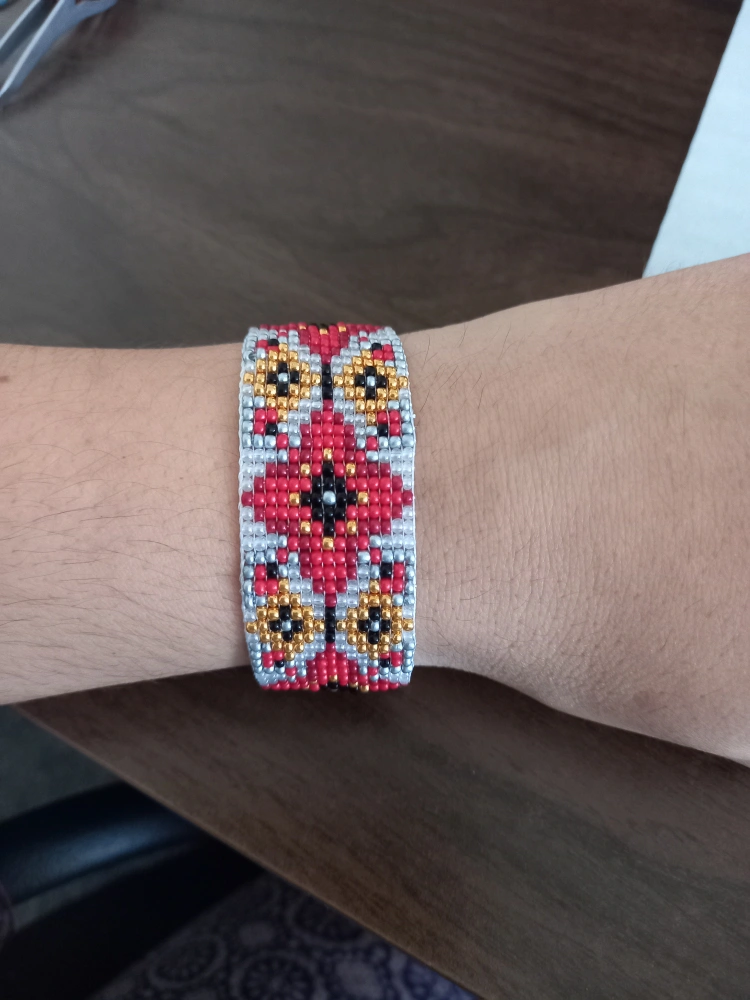 Handmade Beaded Hoop Earrings and Bracelet - Red, Black, Gold
