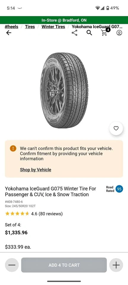 245/50R20 Yokohama iceguard G075. 75% to 90%, 3 tires in great shape. 1 needs replacement. DOT 3220