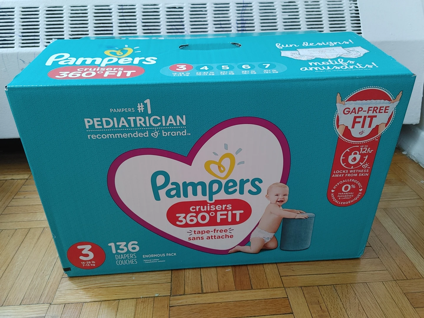 Size 3 Pampers Cruisers 360 - 134 diapers. Open box only used 2 diapers selling because it doesn't fit my daughter. Bought for 34.97 plus tax at Walmart.