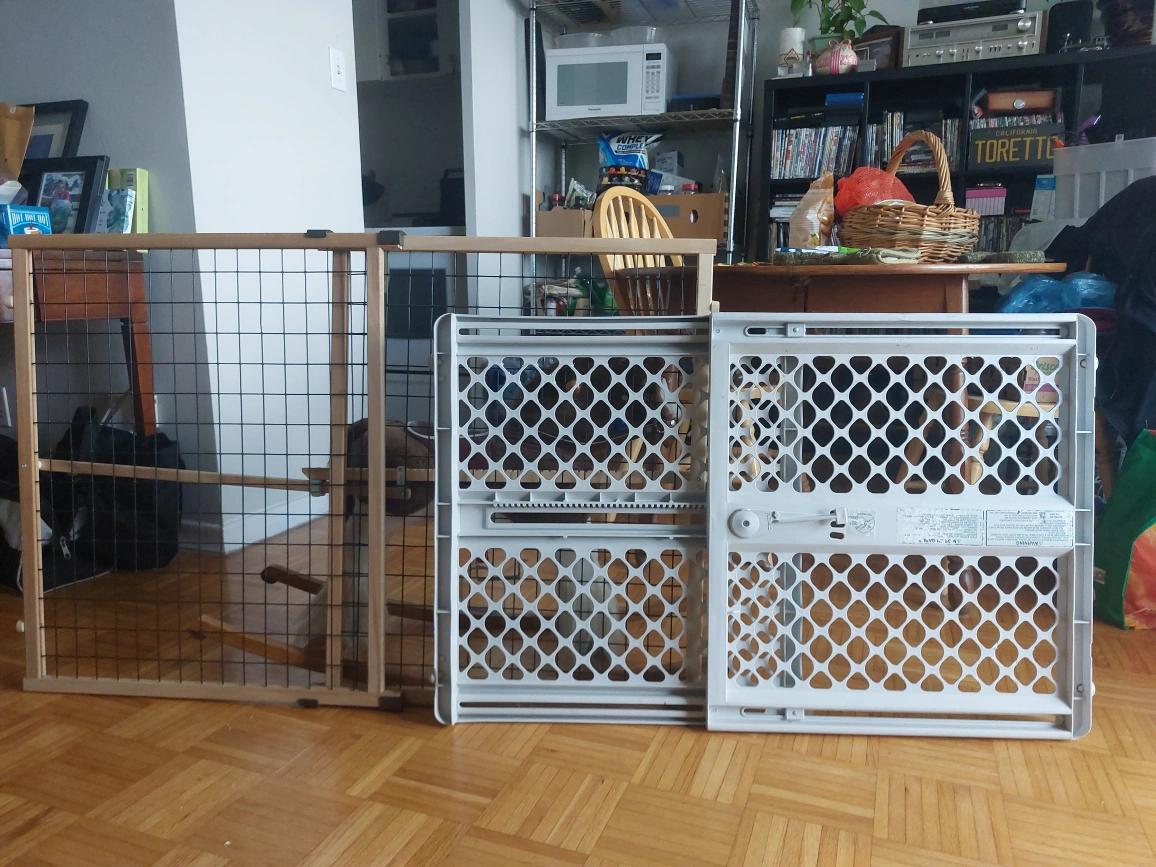 Two all purpose gates to keep children and or pets safe. Both extendable. 1 -wooden gate with metal grate -25.00 2- plastic- 20.00
