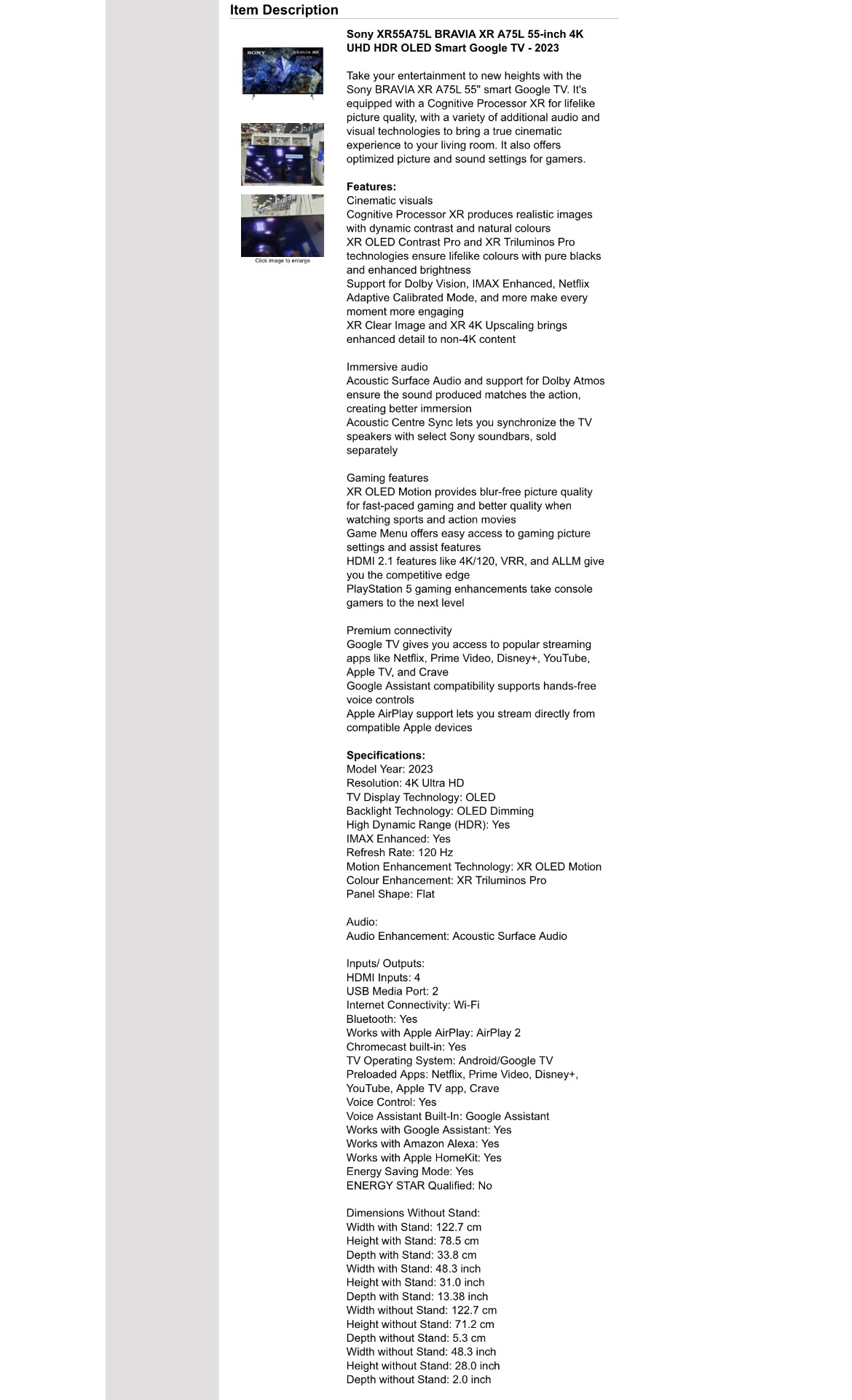 NEW IN BOX! All accessories sealed and included. MSRP $1,699.97 + tax BEST OFFER or FIRST COME! (Offers below $750 will not get a response) Items Included: Sony BRAVIA XR A75L 55” 4K UHD HDR OLED Smart Google TV (XR55A75L) Table-top Stand AC Power Cord Remote Control Items not included: Manual & Guides Unit has been tested and is fully functional. There are styrofoam marks on the top left corner of the screen from shipping. The styrofoam marks are moderately visible on dark screens and faintly visible, to not visible on coloured and light screens depending on image (see images 9-10). OEM box included. Pay via Cash, Credit, e-transfer, crypto, Apple Pay, & MORE! **Delivery and Shipping is possible depending on location and small fee. Delivery and shipping fees must be paid in advance by you regardless of purchase** https://www.bestbuy.ca/en-ca/product/sony-bravia-xr-a75l-55-4k-uhd-hdr-oled-smart-google-tv-xr55a75l-2023-only-at-best-buy/17306917 Caveat emptor It is the duty of the buyer to inspect, test, and agree to our products prior to completing transaction. You accept full responsibility of the product the second money exchanges hands even if you choose to not test and inspect. If the unit is factory sealed and you decide to break the seal to inspect and test, you agree to complete the sale as long as the product inside is in adequate condition.