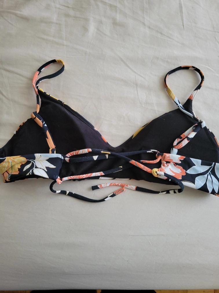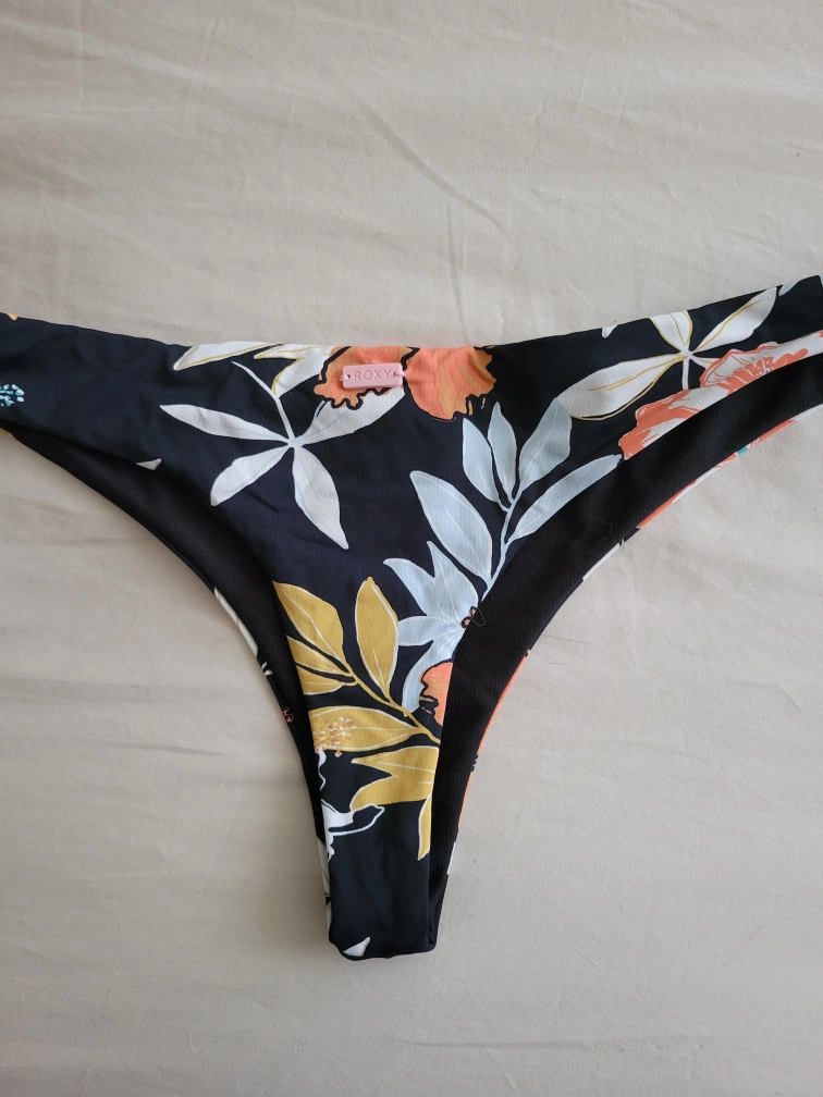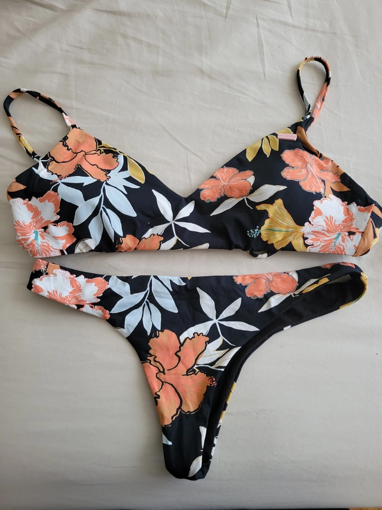 Roxy bathingsuit set. Top is a medium (medium coverage) but could fit a small (fuller coverage) as the shoulders are adjustable and the back strap is adjustable. Bottoms are a size small and low coverage (more butt is out than normal). Stretchy material and style could work for someone who is a medium. Roxy bathingsuits are amazing quality and last a long time. I am only selling as it doesn't fit anymore.
