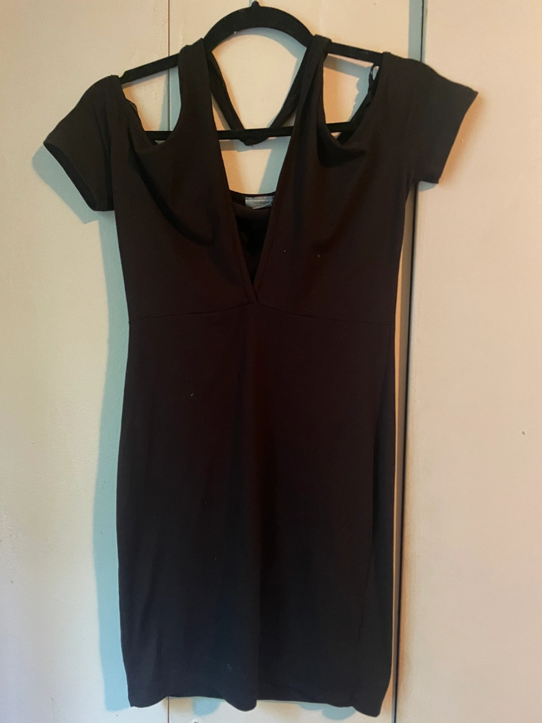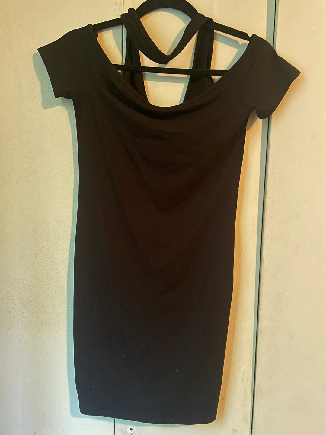 Short black halter dress with short sleeves! Perfect for summer or dinner dress as it has a deep V neck! Lightly worn, no major damages, stains or discolouration! Has some stretch to it and comfortable fabric