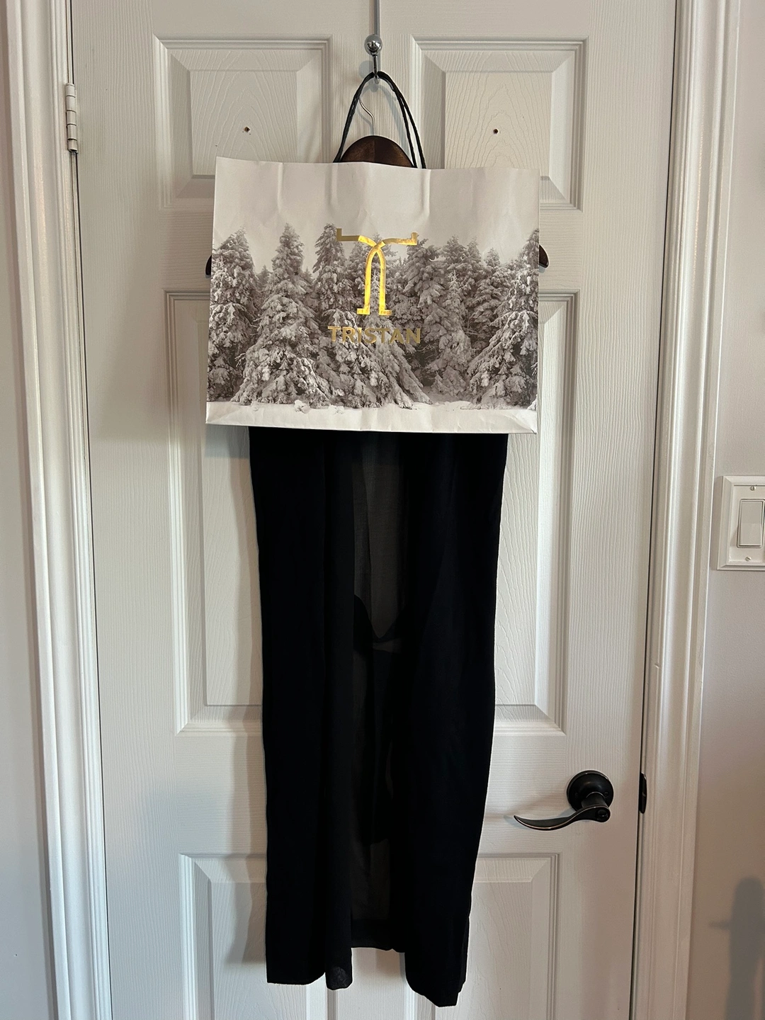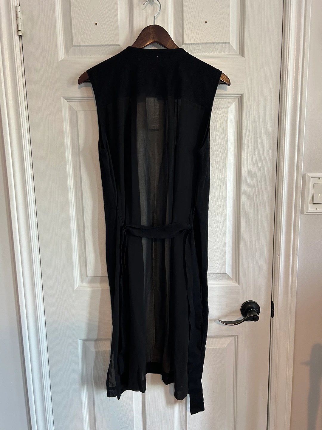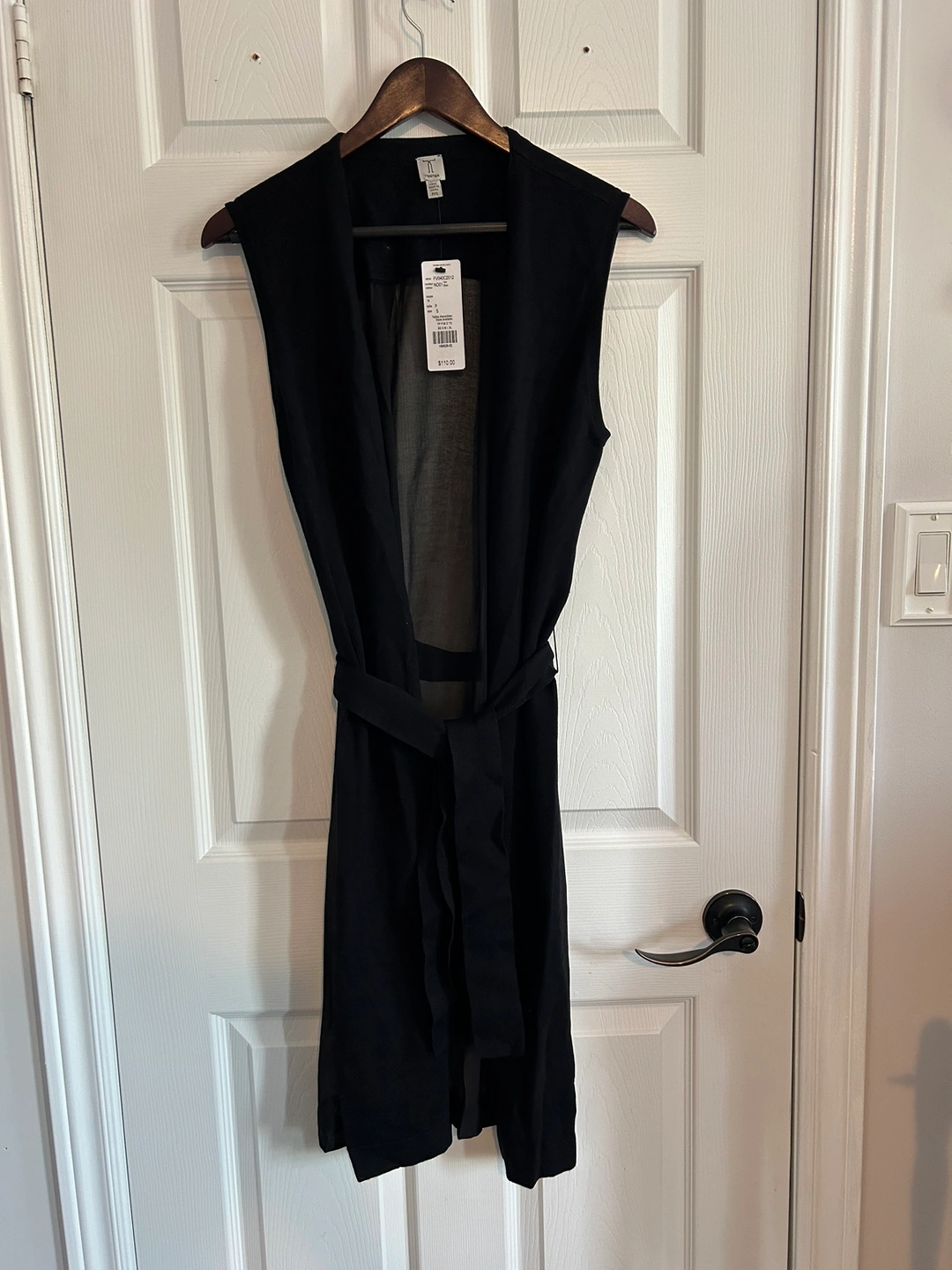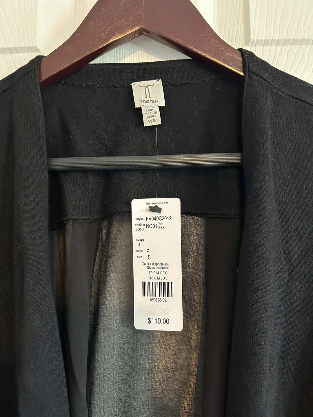 Brand New Chic Tristan Black Long Vest Cardigan (size S) This is a gorgeous top, brand new with tag and still has the Tristan bag it came in. I bought it and totally forgot about it and now it doesn’t fit anymore 😳. The sheer back makes it stand out and the belt tie allows you to dress it up or wear it casual. Retails for $110+tax. Clean, smoke free home Pick up in North Ajax or Central Hamilton