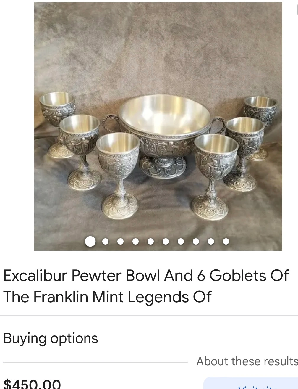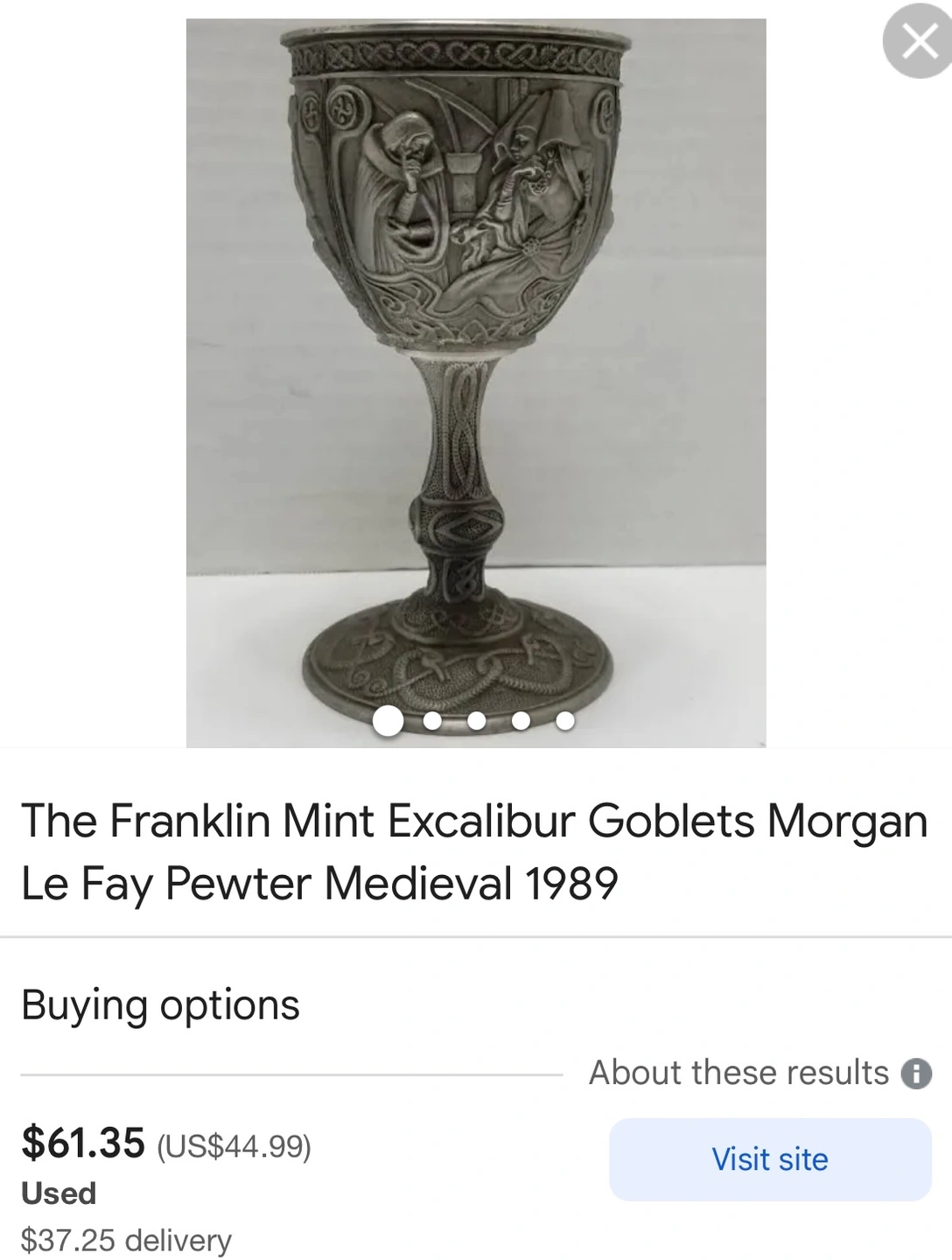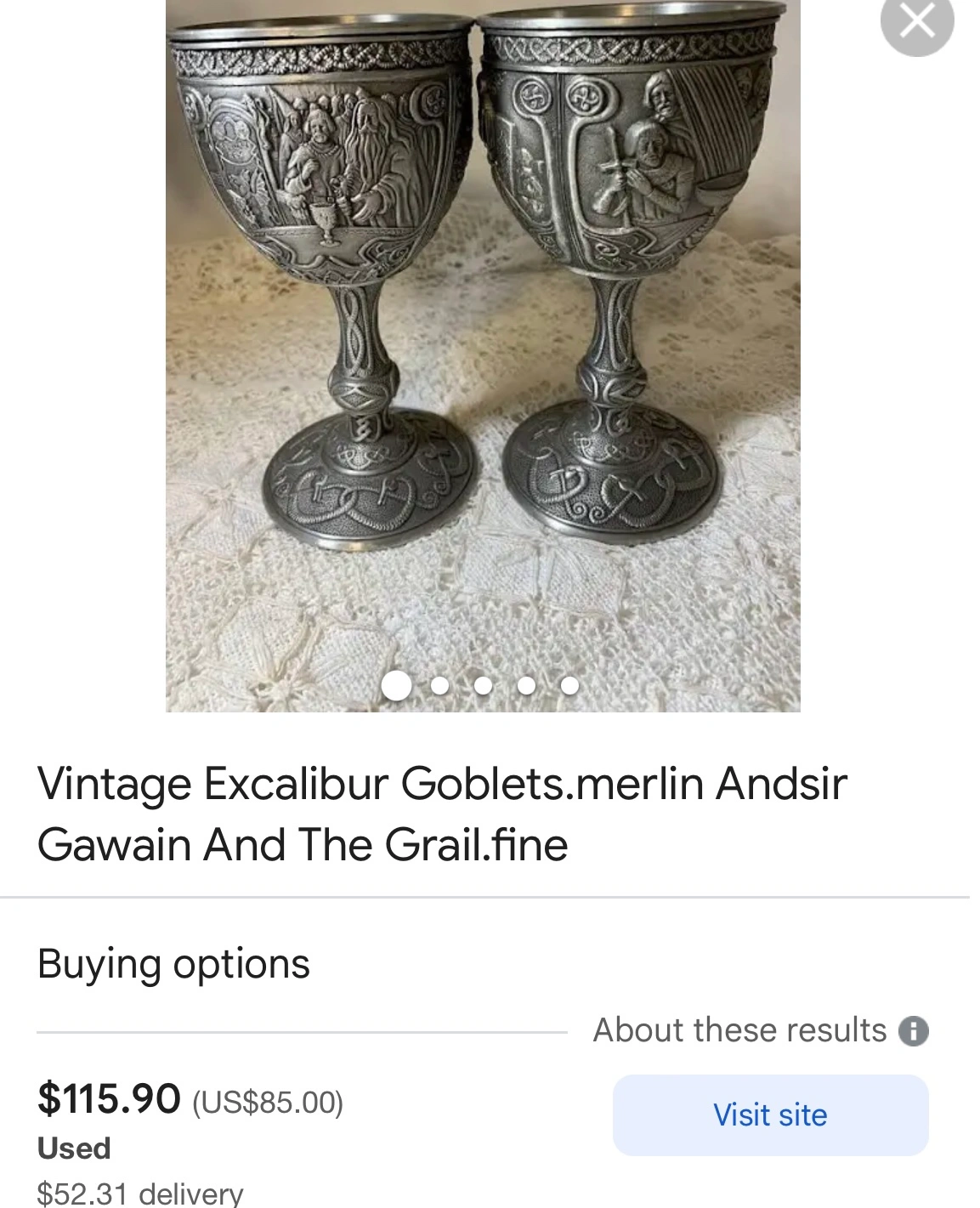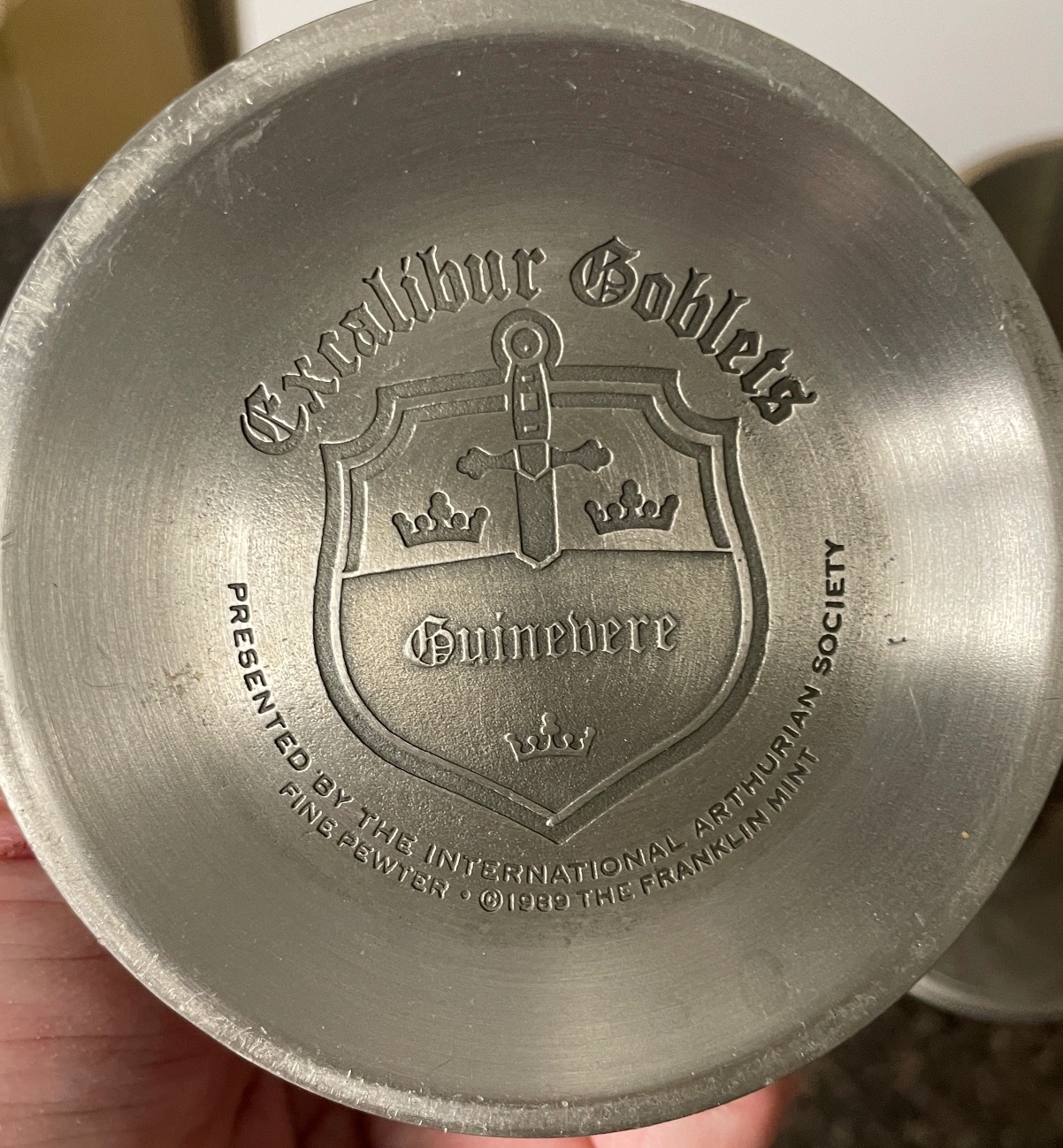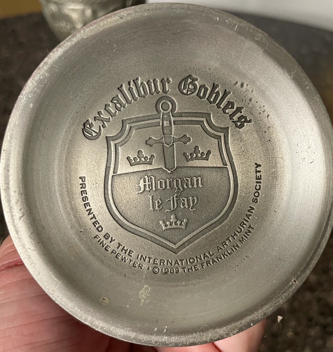 $90 for both or $50 each. Two (of the original 6) Pewter Camelot Goblets. Morgan La Fay and Guinevere. Food safe Pewter, holds 8 fl. Oz. Each Goblets weighs aprox. 28oz and stands just under 7.5" with a 3.3/8" top diameter Will not be open to offers until it has been up for a minimum 3 weeks. Sales are going to the well being of our cats and our own mental health recovery. Please note that this item is presently in a friend’s basement in Mississauga. You will be picking it up from there. 2 cat household. No smoking in household.