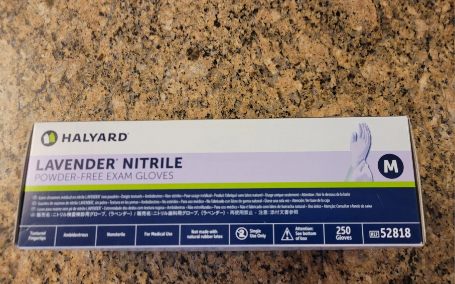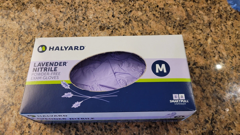 Halyard Lavender Nitrile powder-free exam gloves. Size: Medium Purchased during COVID, used two or three and no longer free. Comes from a smoke & pet free home.