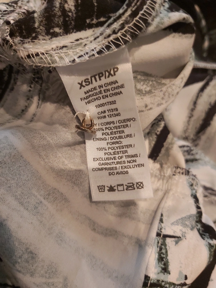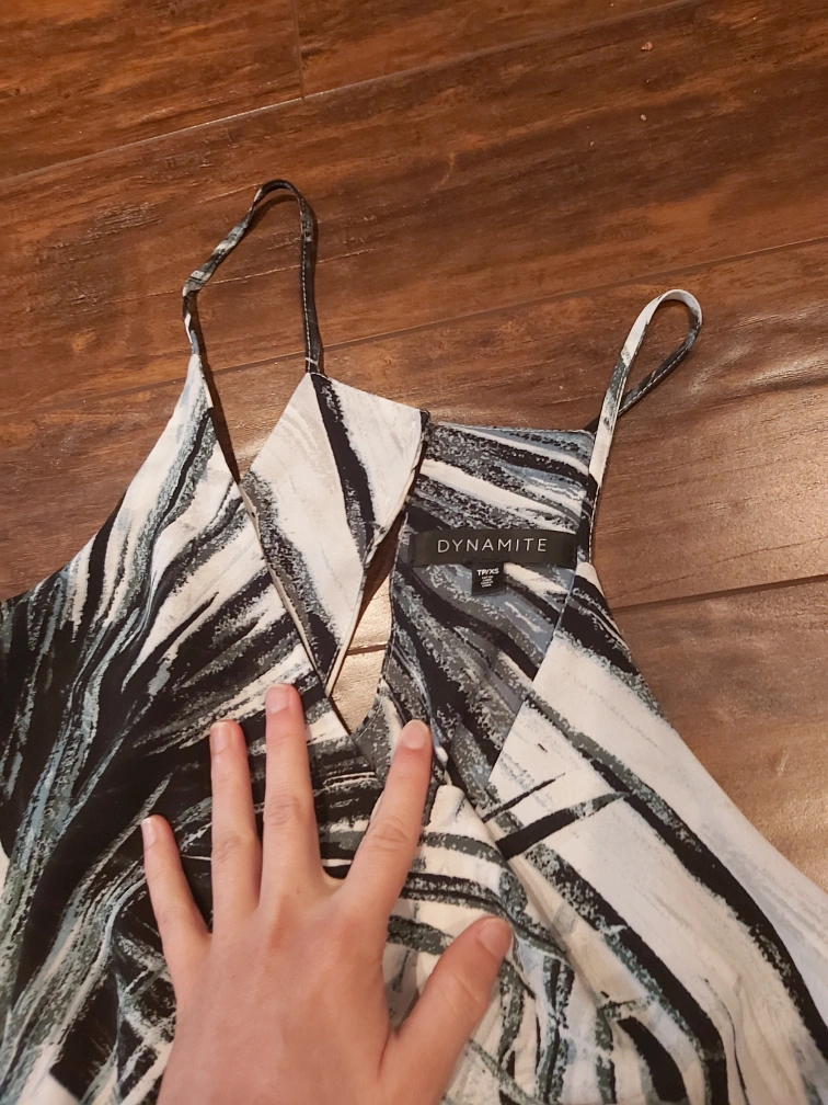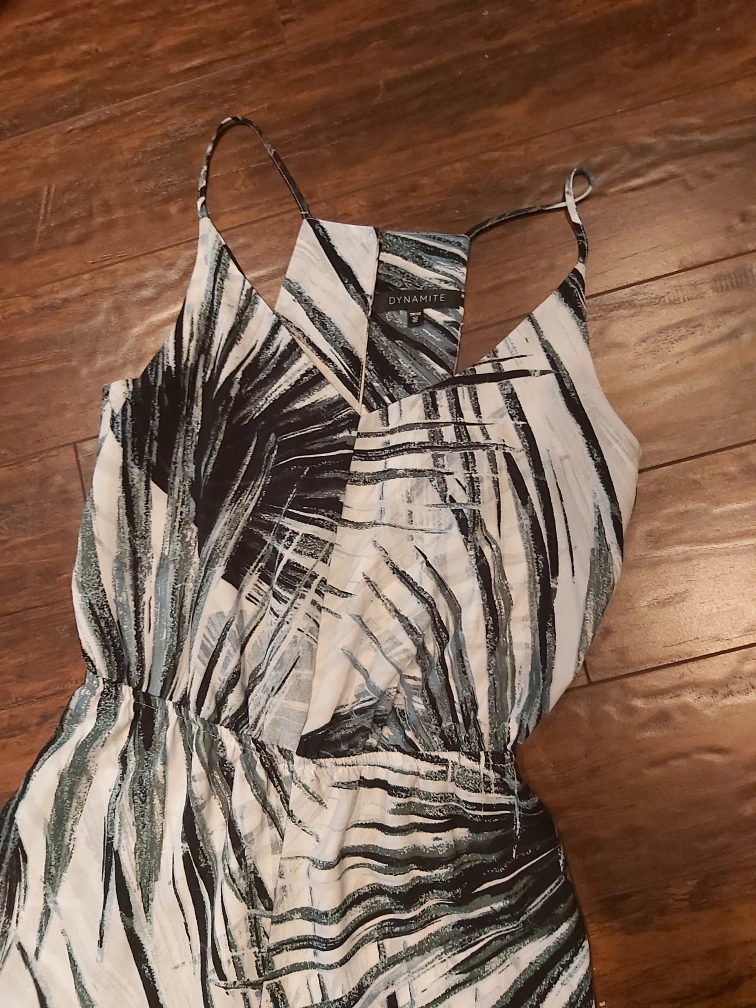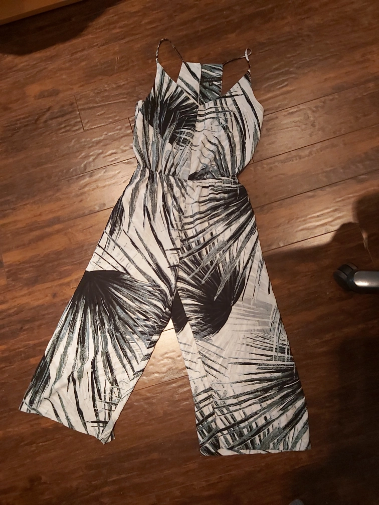 Brand: Dynamite Type: Tropical printed jumpsuit Colour: White with green leaves Size: Extra Small (XS), but fits Small (S) too Composition/material: 100% polyester Additional measurements: around 30 cm scrunchy stretchy waist area, around 111 cm total length Condition: Great