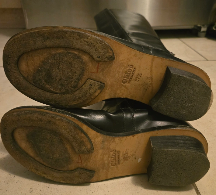 Very Cool Vintage Italian Leather Boots by Chloe With Back Zip and Very Cool & Unique Leather Soles. Used but lots of love still in 'em. Size 37.5