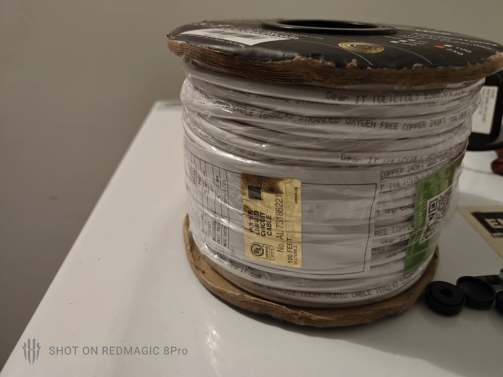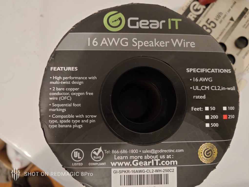 New spool of 16 AWG speaker wire. UL CM CL2 in-wall rated. Oxygen-free copper conductor. Compatible with screw, spade, and banana plugs. High-performance multi-twist design. 250 ft