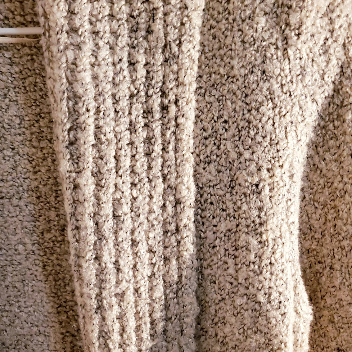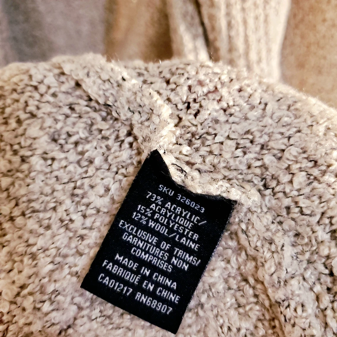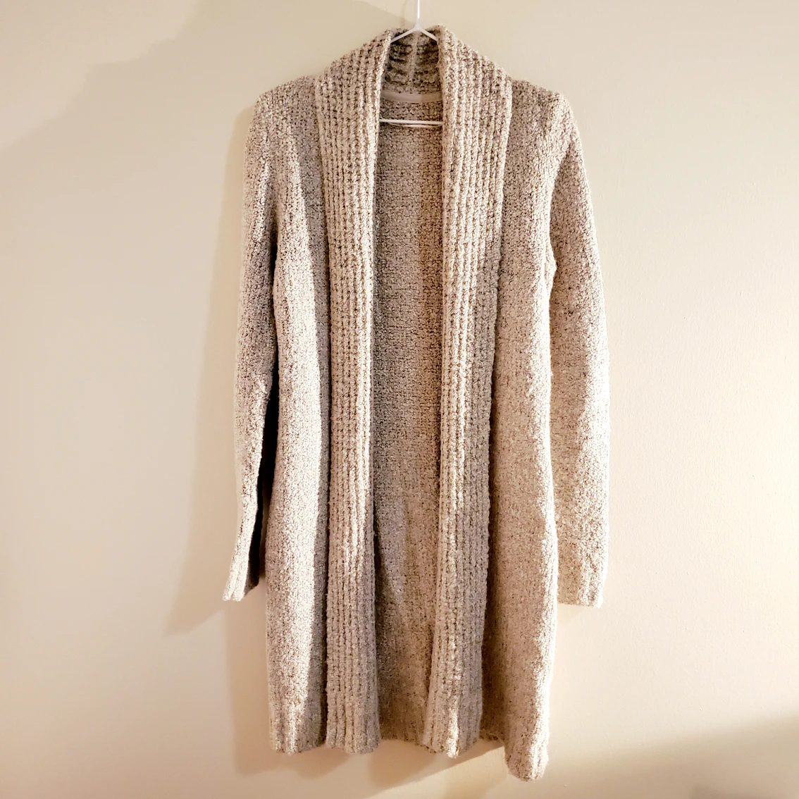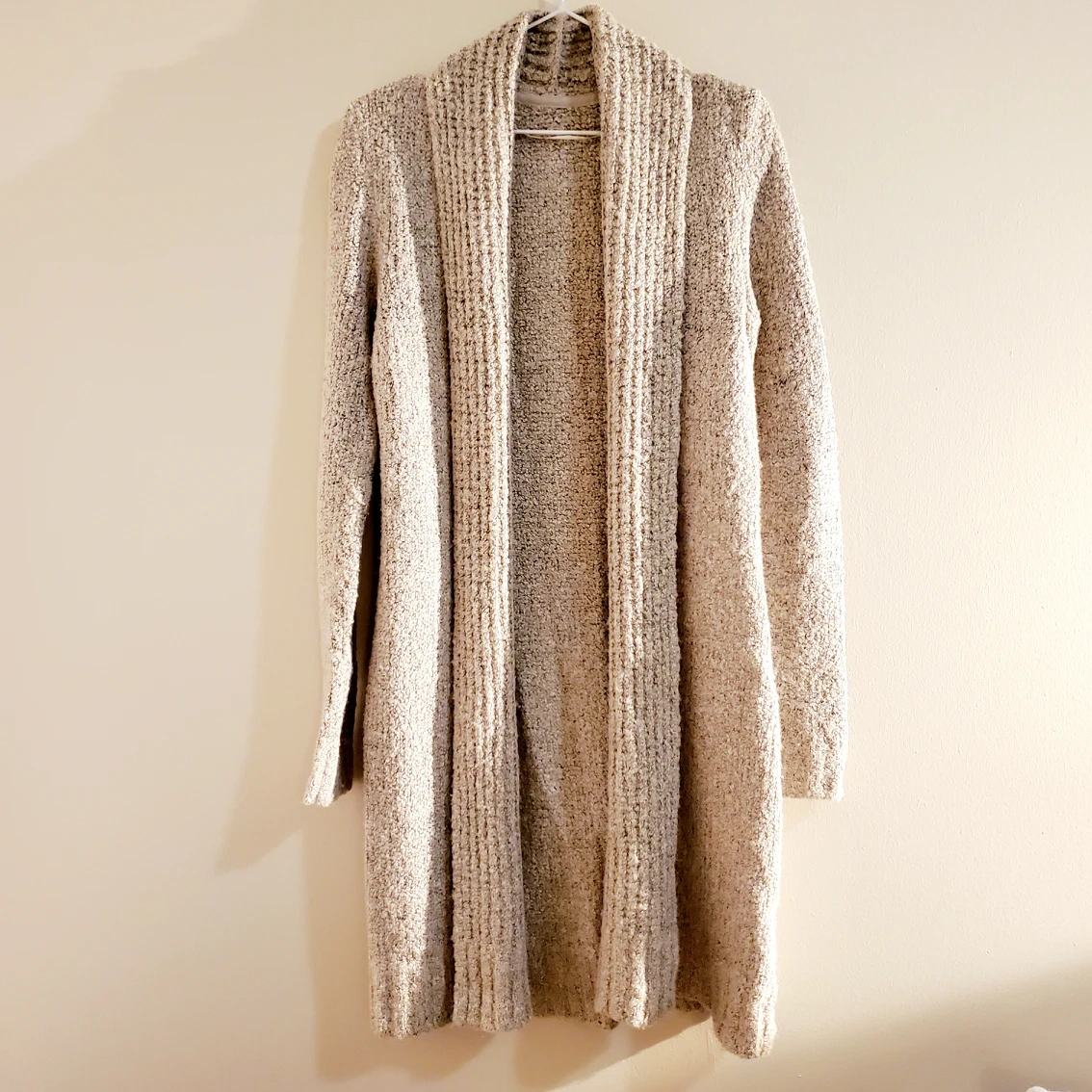 Snuggle in this long cozy comfy robe cardigan. Lightweight but warm, in earthy neutral colour. Very flattering. Length 38" 73% acrylic 12% wool 15% polyester Available for pick-up at Bayview Village (Smoke free pet free home)
