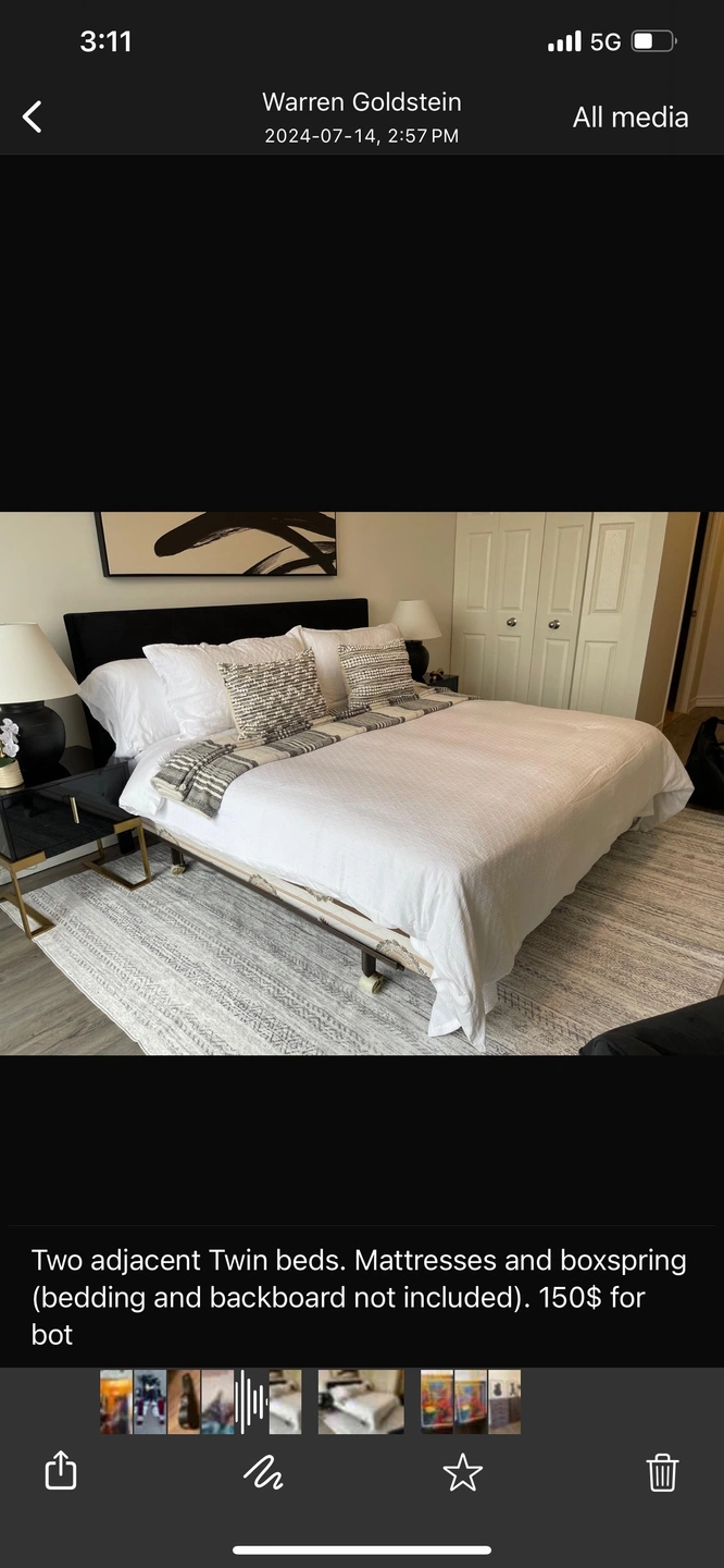 Comfy twin beds( pushed together to make King bed in photo) with box springs and braces with wheels. Does not include headboard or linens $150 takes both beds/ box springs/ braces and wheels