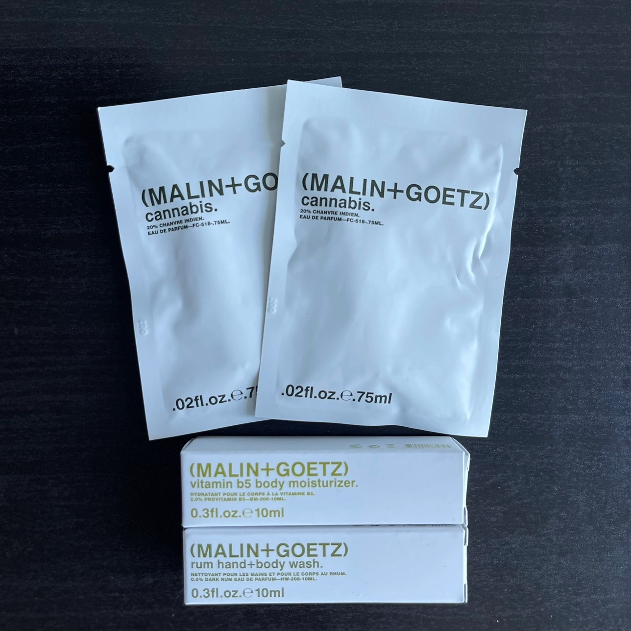 Brand new Malin+Goetz mini set Includes: 2x Cannabis Eau de Parfum (0.75ml each) 1x vitamin b5 body moisturizer (10ml) 1x rum hand + body wash (10ml)