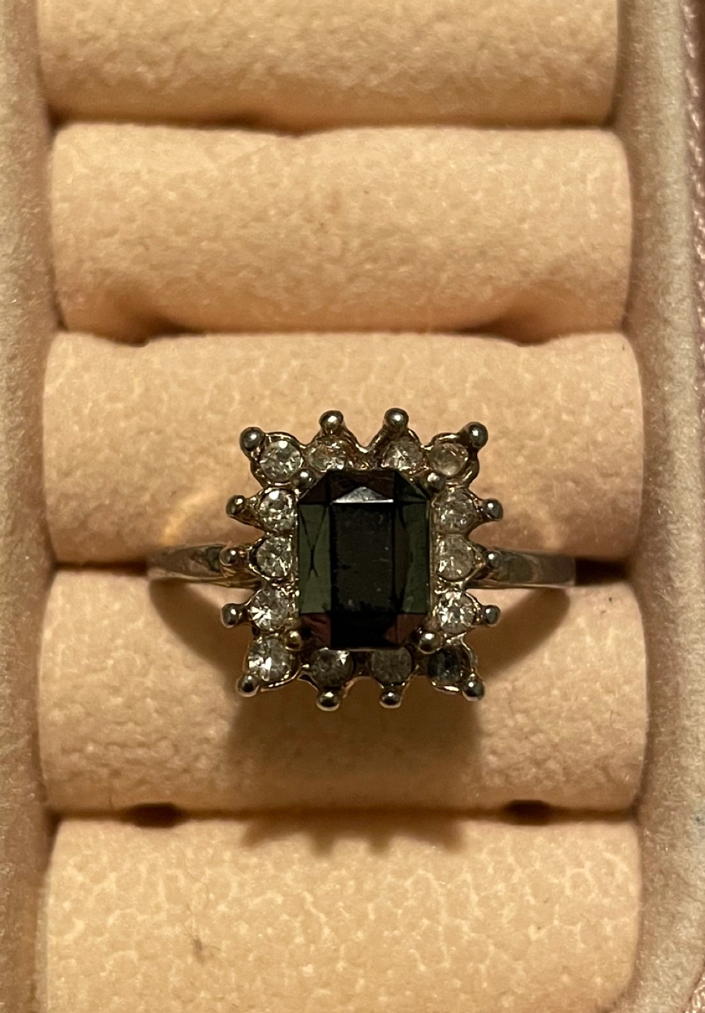 Thrifted this ring a few years ago but never wore it much Has a stone missing from it and a bit of scratching on the black stone but has lots of wear left :) Not real silver but doesn’t have major visible tarnish I believe it’s a size 8