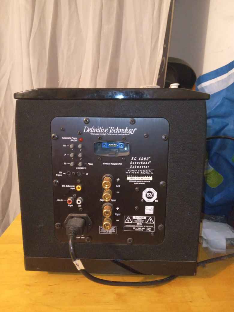all the descriptions are on the back of the speaker. Base is powerful and very loud.