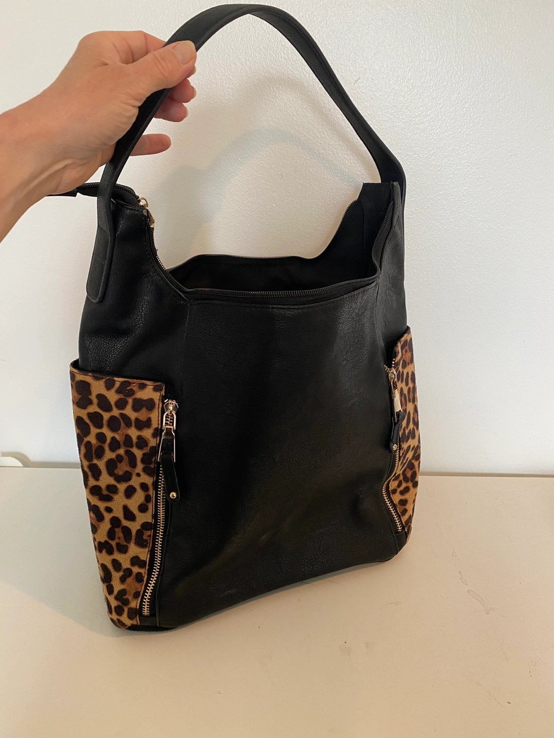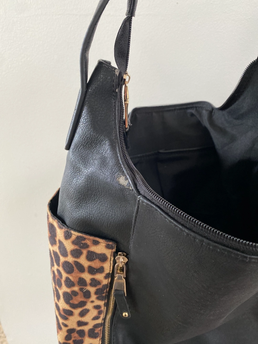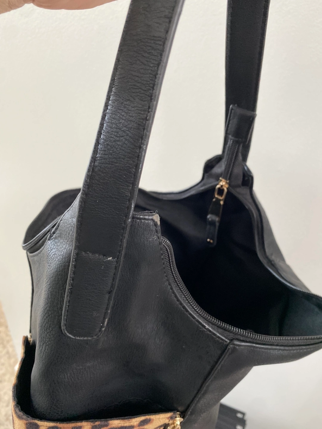 Club Rochelier purse: • Black in colour with leopard print side pockets • All zippers work well • Approx 15”w x 12”h + plus handle • There’s a couple of small scuff marks. See last 2 photos. Pick up ONLY in East End Toronto (Gerrard St East and Jones Ave area)