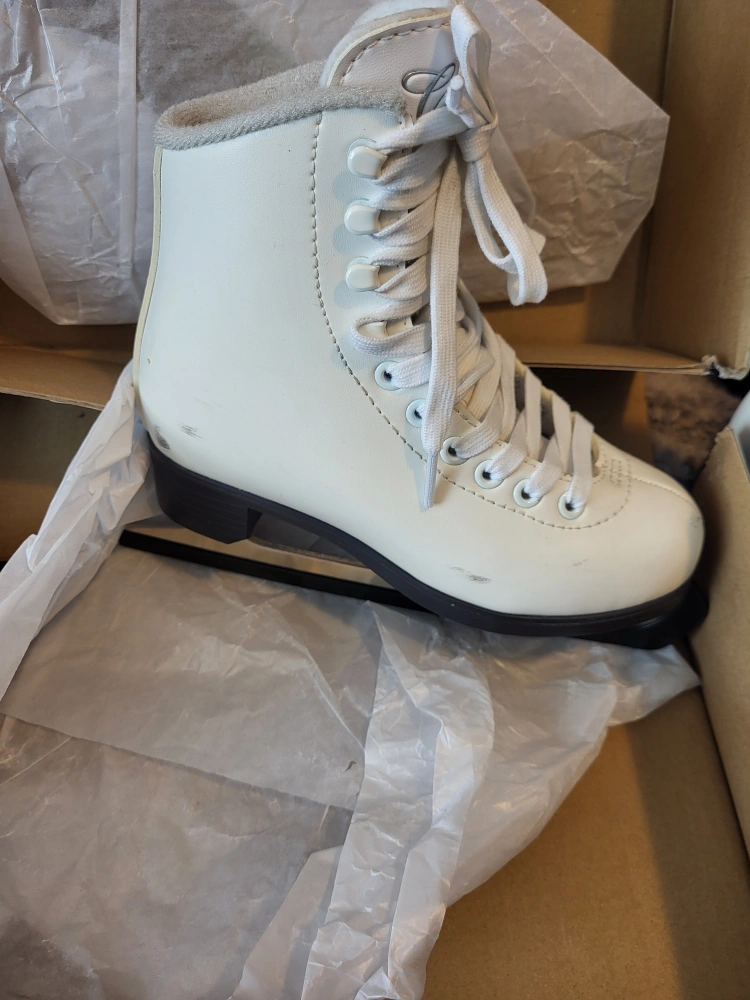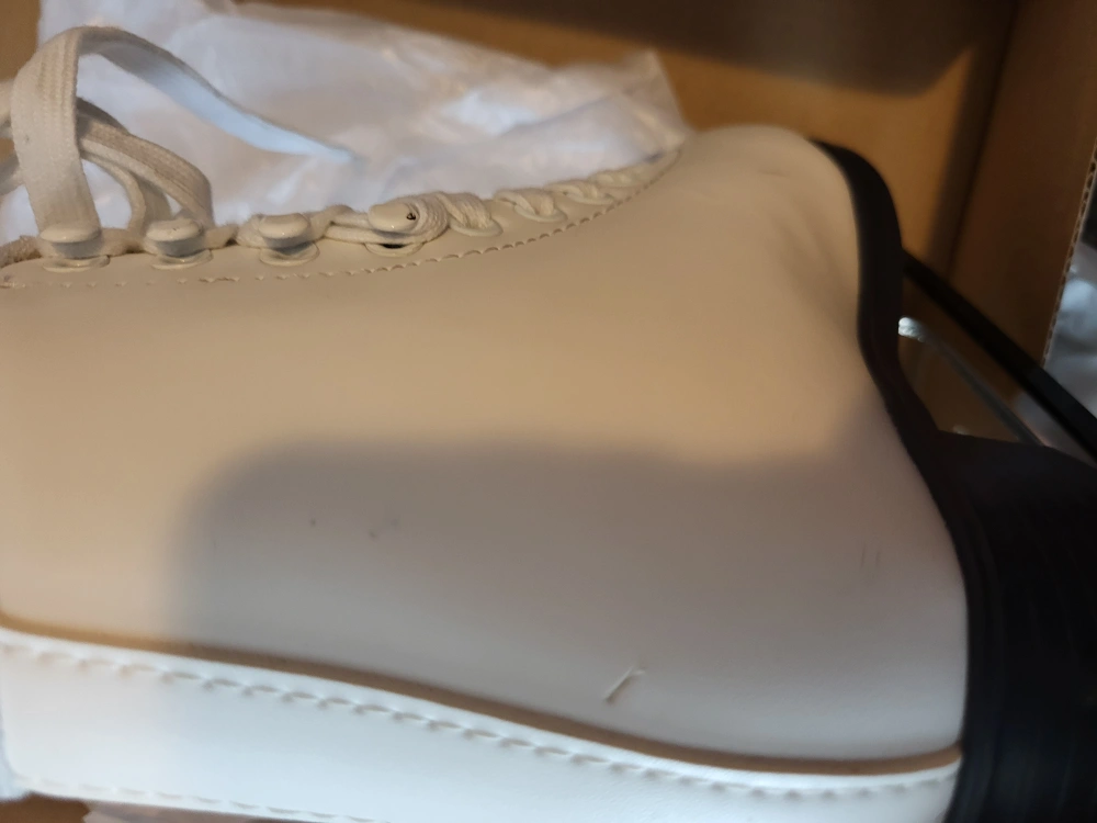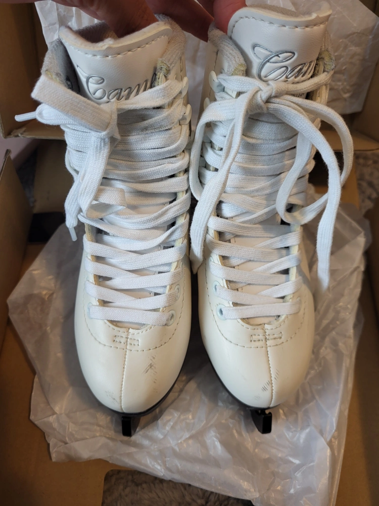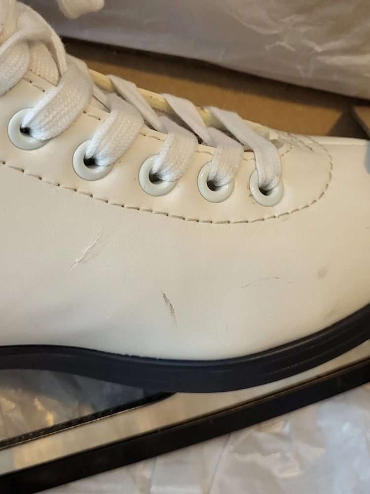 Shares are in good condition. Have a few marks. Left skate has one scratch and one cut. (!shown in pictures) Pick up only.