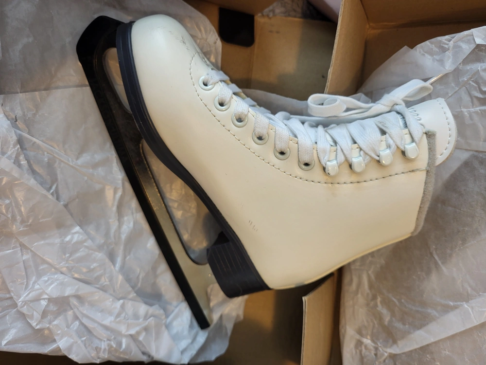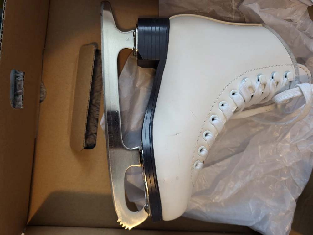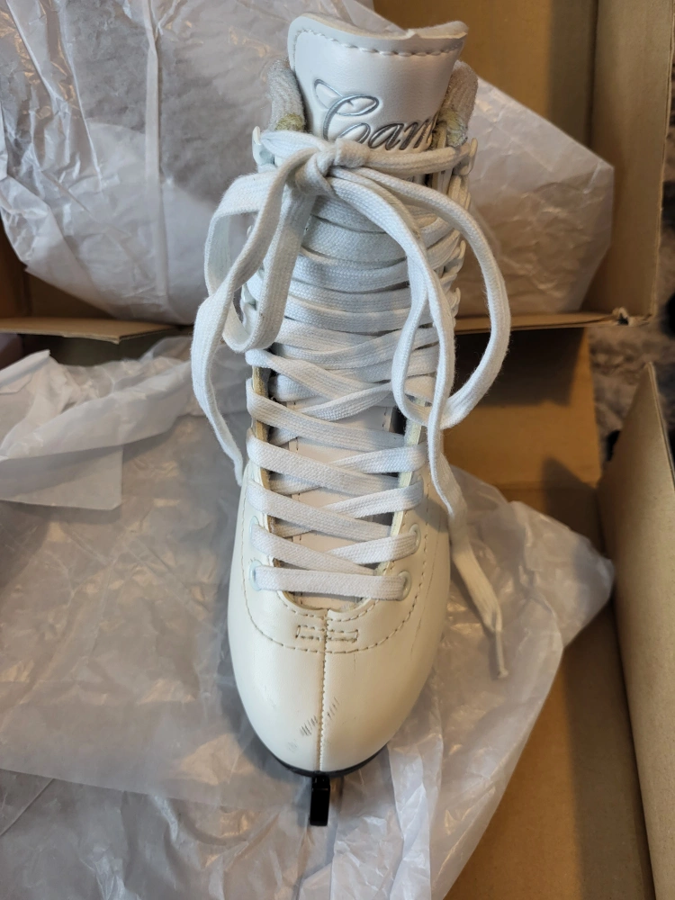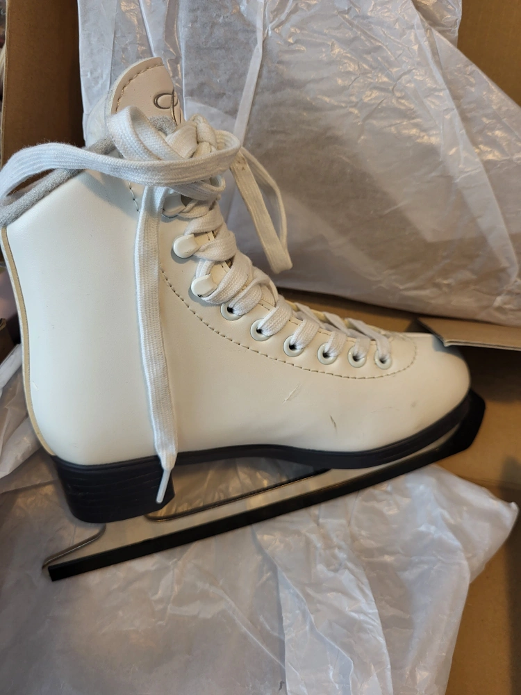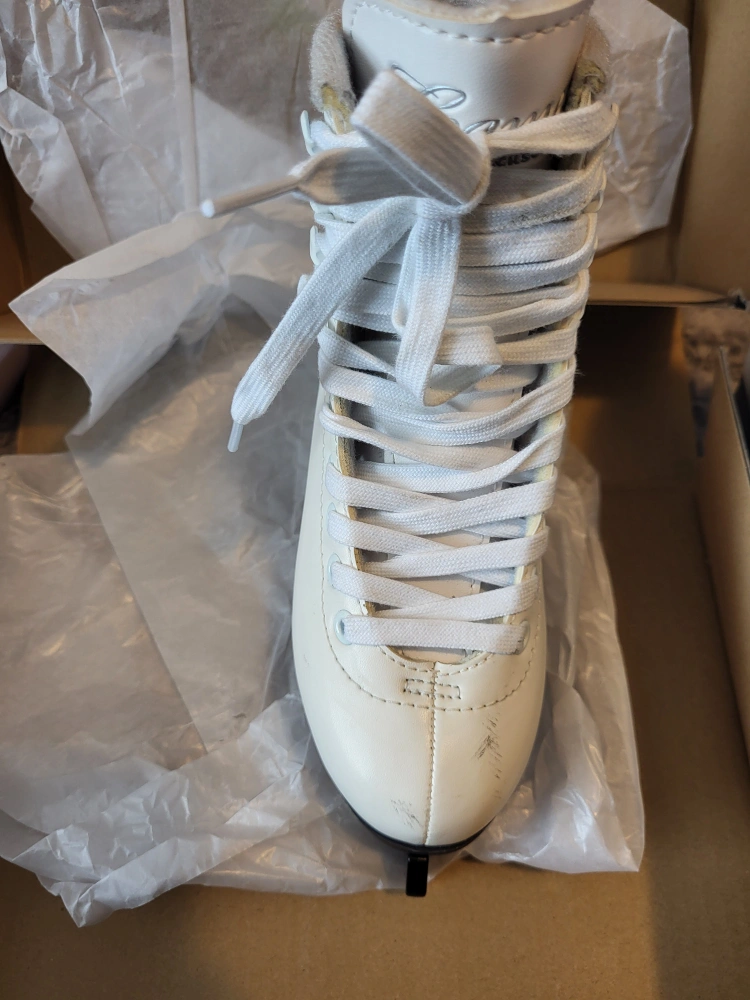 Shares are in good condition. Have a few marks. Left skate has one scratch and one cut. (!shown in pictures) Pick up only.