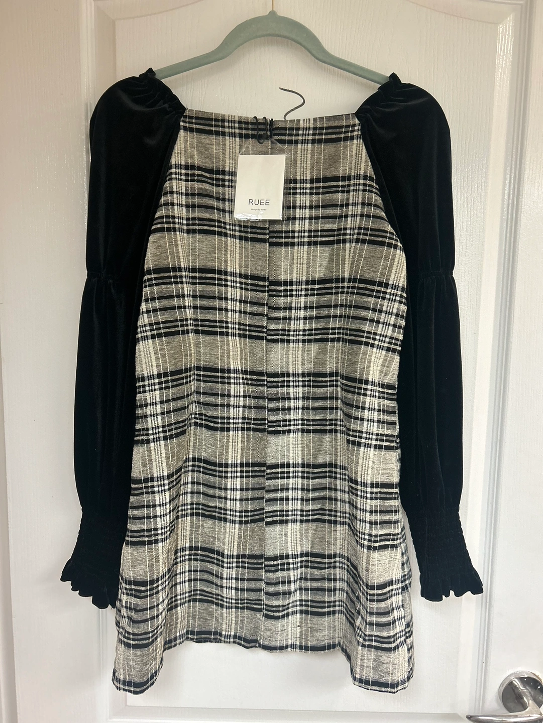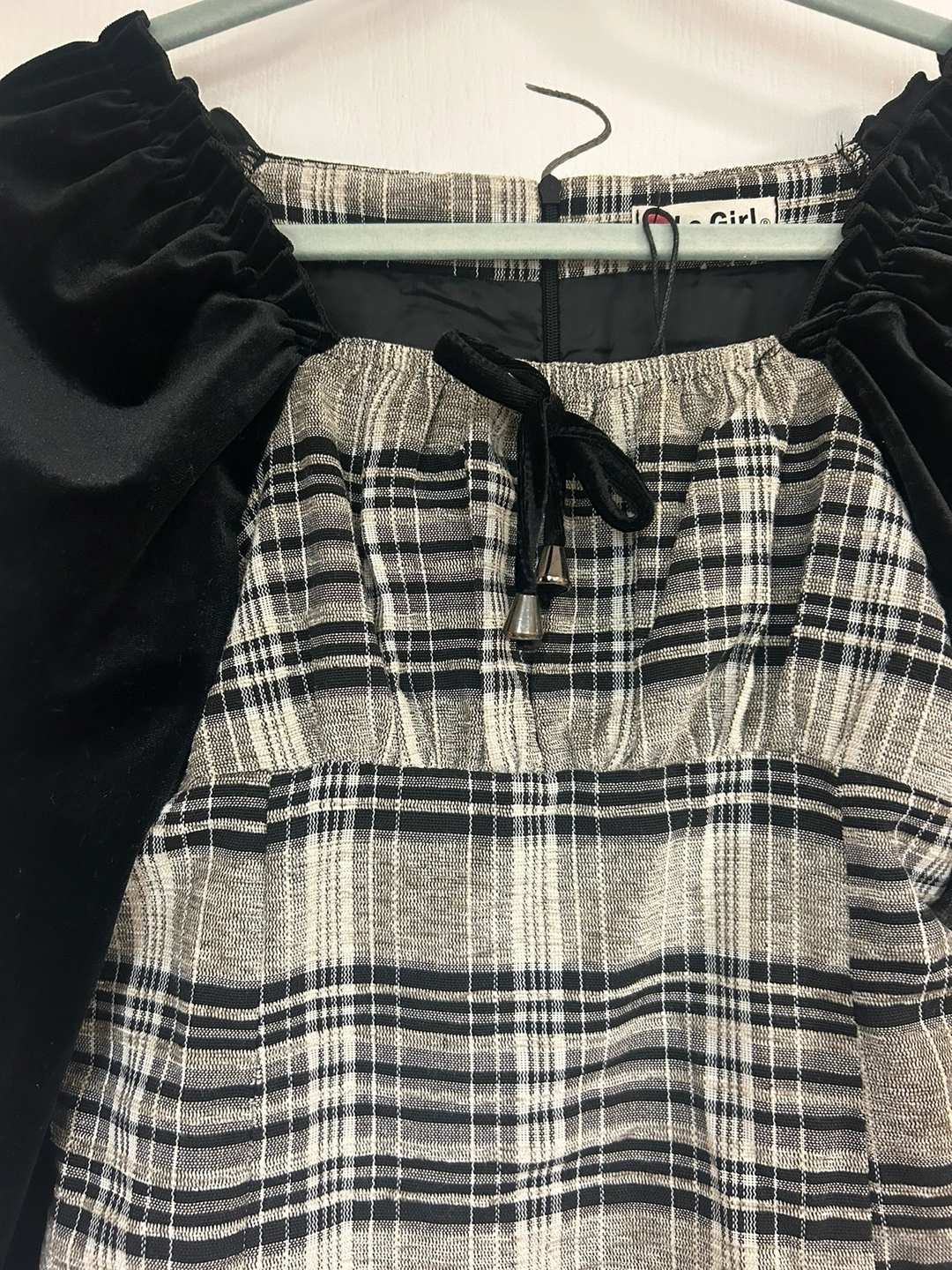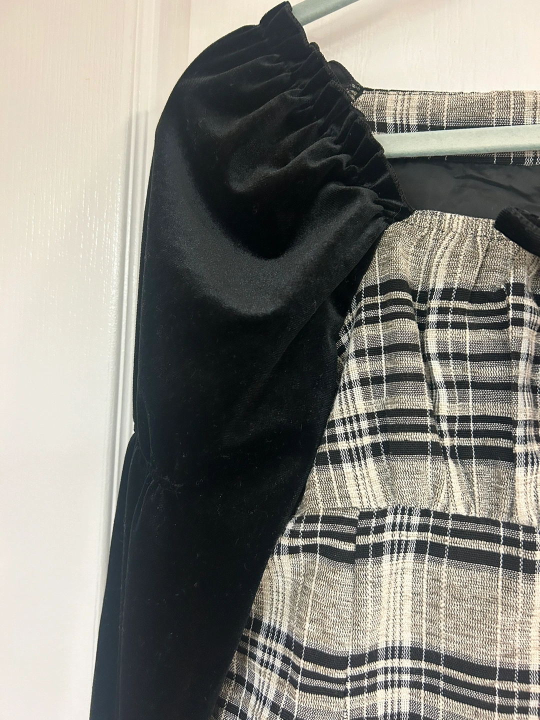 Selling this stylish plaid and velvet dress. It’s one-size (fit for size M or S) Perfect for a chic, vintage-inspired look. The dress features a plaid pattern with elegant velvet sleeves. It’s new with tag and great for many occasion. 👗✨