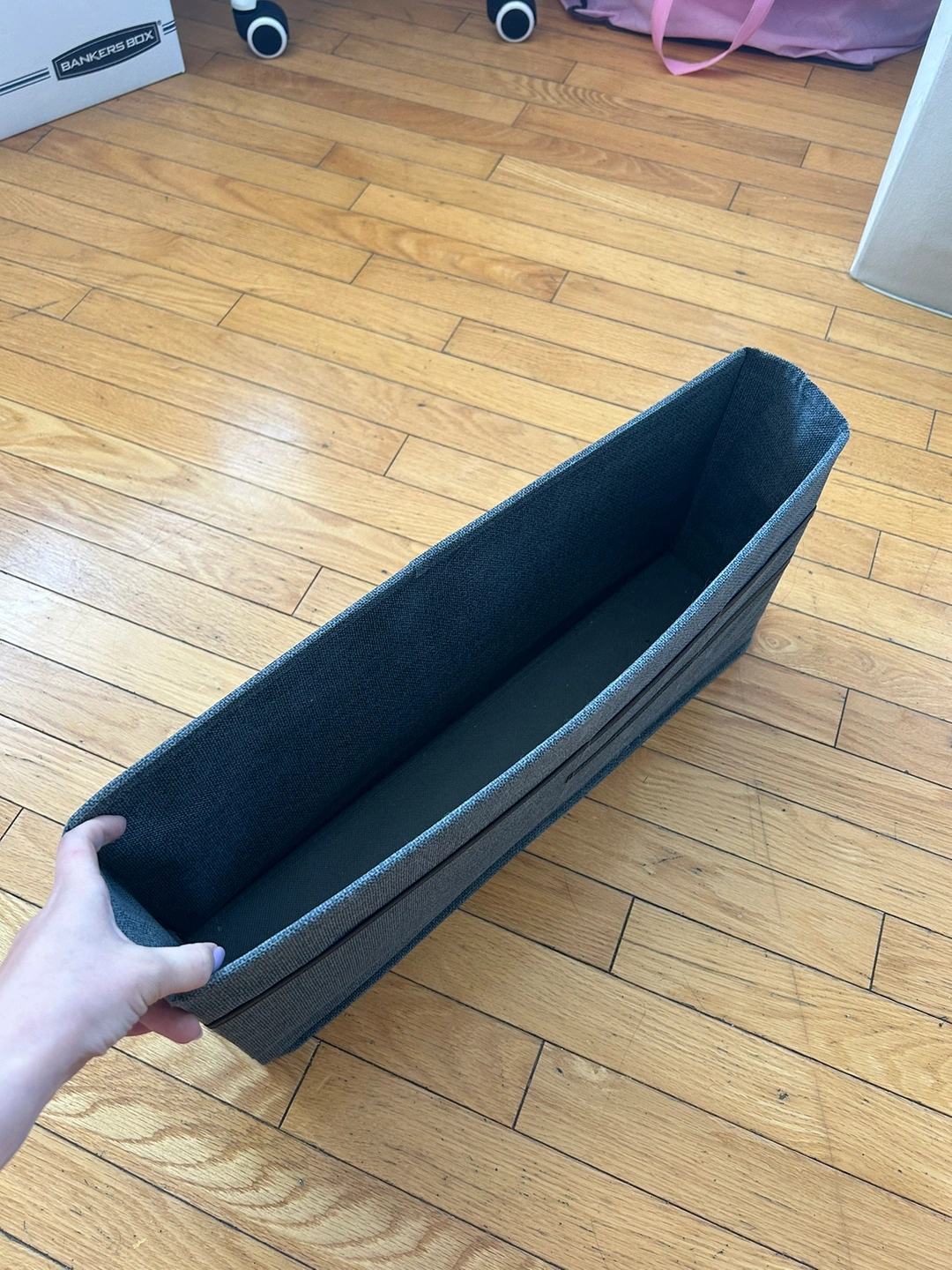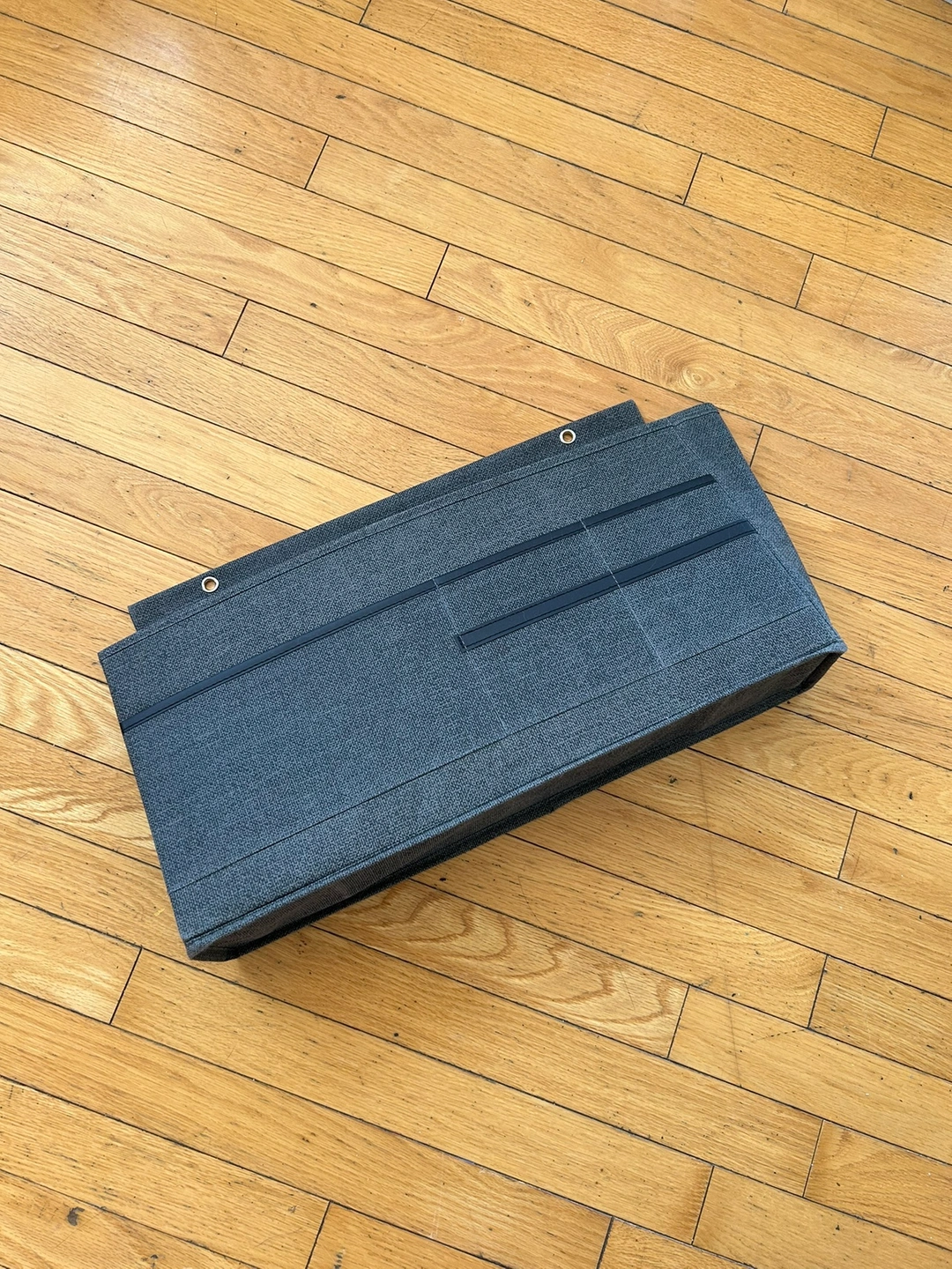 brand new fabric hanging desk organizer in grey. used once during moving. made to hang on desk or wall with reinforced grommets on a flap. features one large pocket with smaller pockets on the outside 19in x 10in x 5in