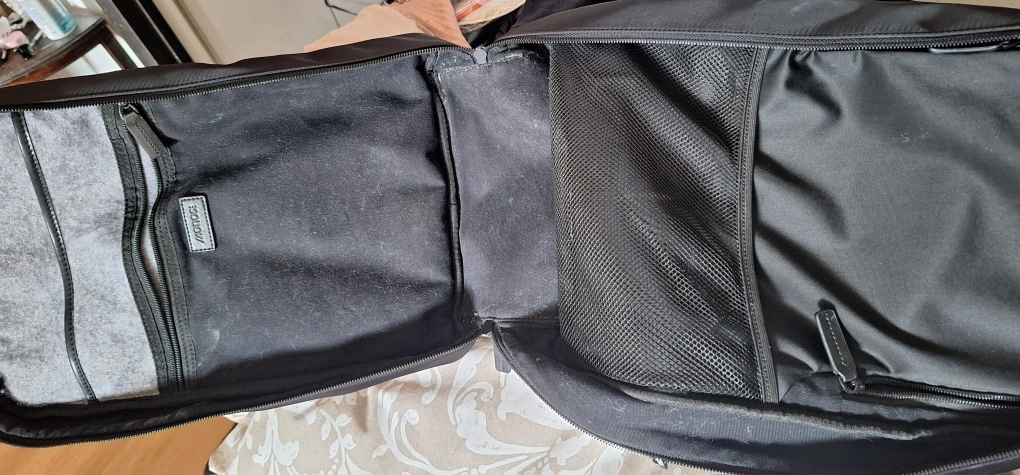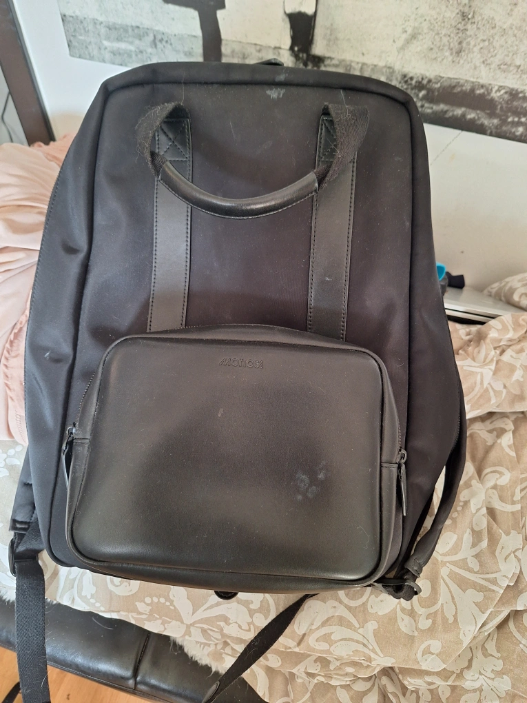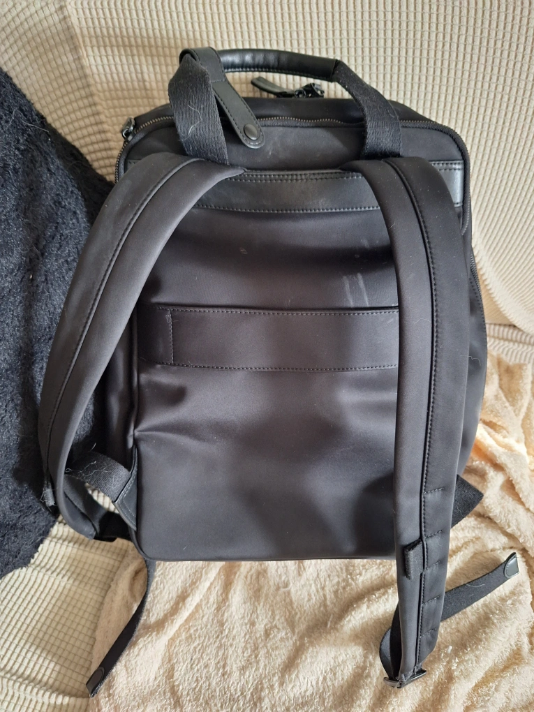 purchased last year for $240. smoke free home with 1 cat. A few scuffs but otherwise bag is in tact. removable vegan leather pouch in front and good for carrying laptops etc. Bag expands quite a bit to suit your needs. Comfortable