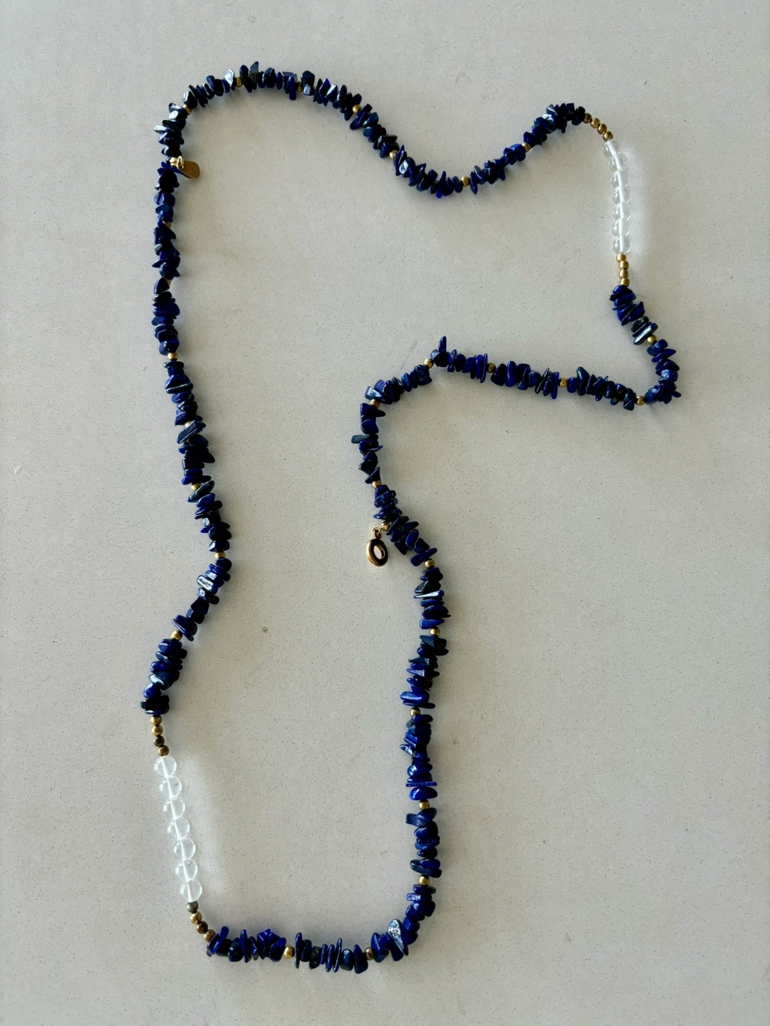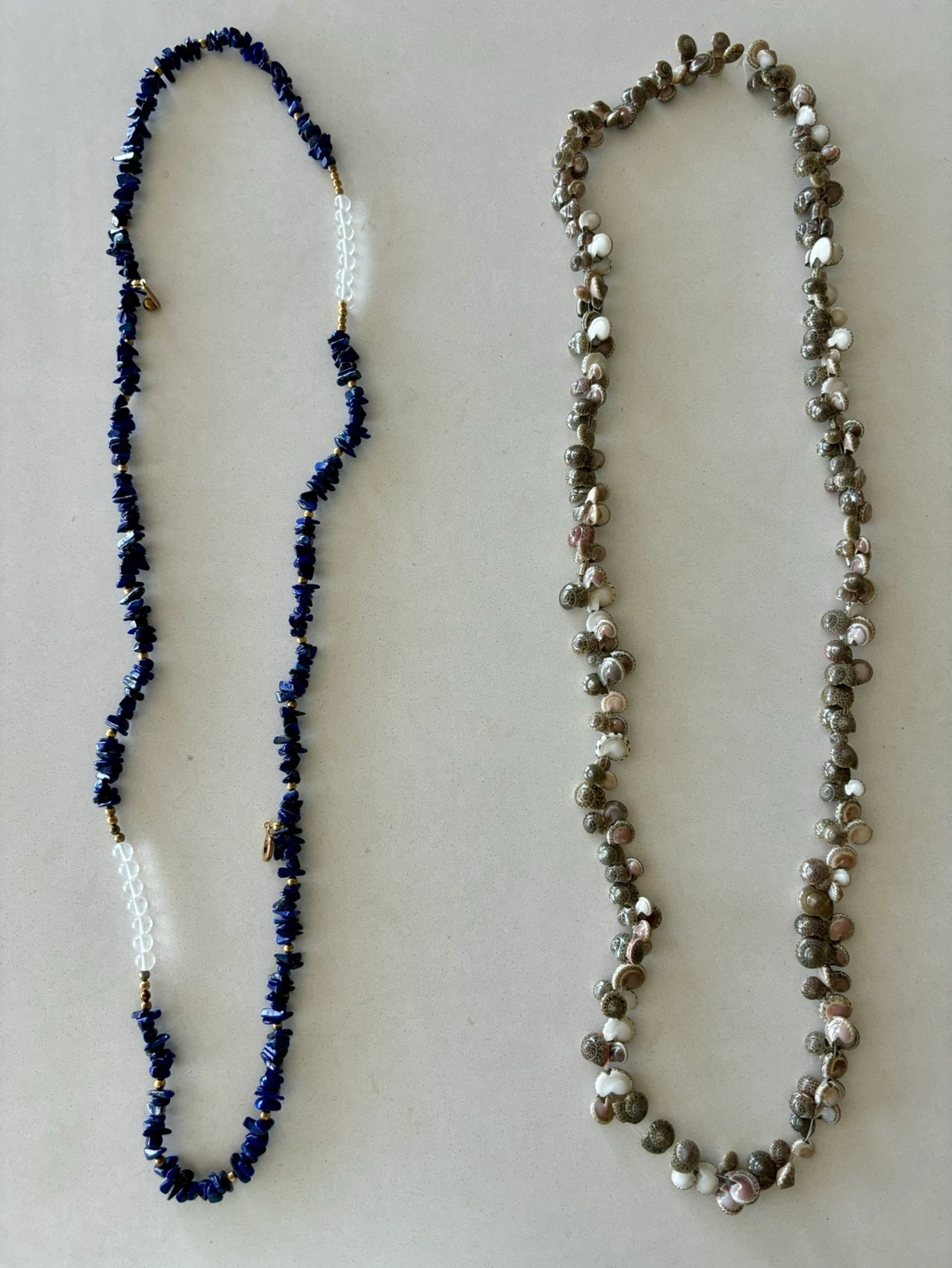 Set of two beaded necklaces, one made of blue stones and clear beads, the other made of small shells, $5 for both, or $3 each. Click on my name above to see my other listings and pickup locations.