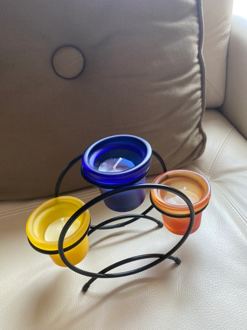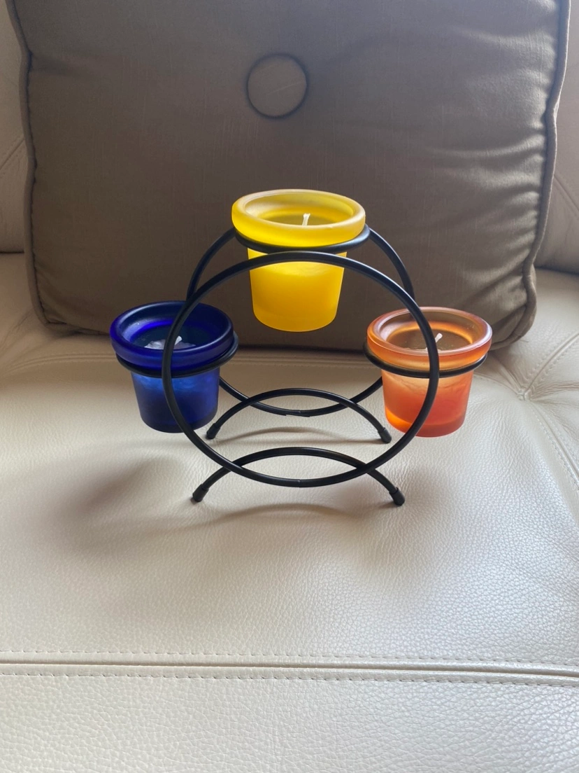 A brand new candle holder with 3 glass containers with unused candles. Holder made of black metal. From a pet and smoke free home. Pickup in the St. Lawrence market area of downtown Toronto. Cash only