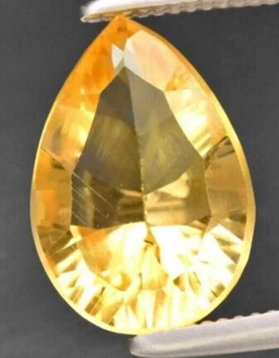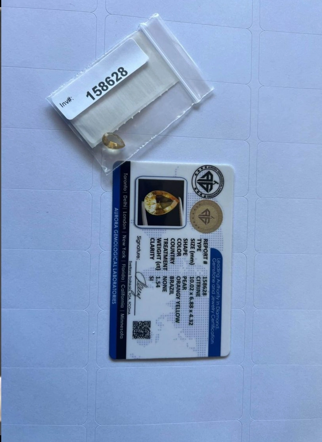 CERT SI 1.54 ct Citrine Brazil REPORT # - 158628 TYPE - Citrine MEASUREMENT (mm) - 10.02 x 6.88 x 4.32 COLOR - ORANGY YELLOW SHAPE - Pear ORIGIN - Brazil TREATMENT - NONE WEIGHT (ct) - 1.54 CLARITY - SI