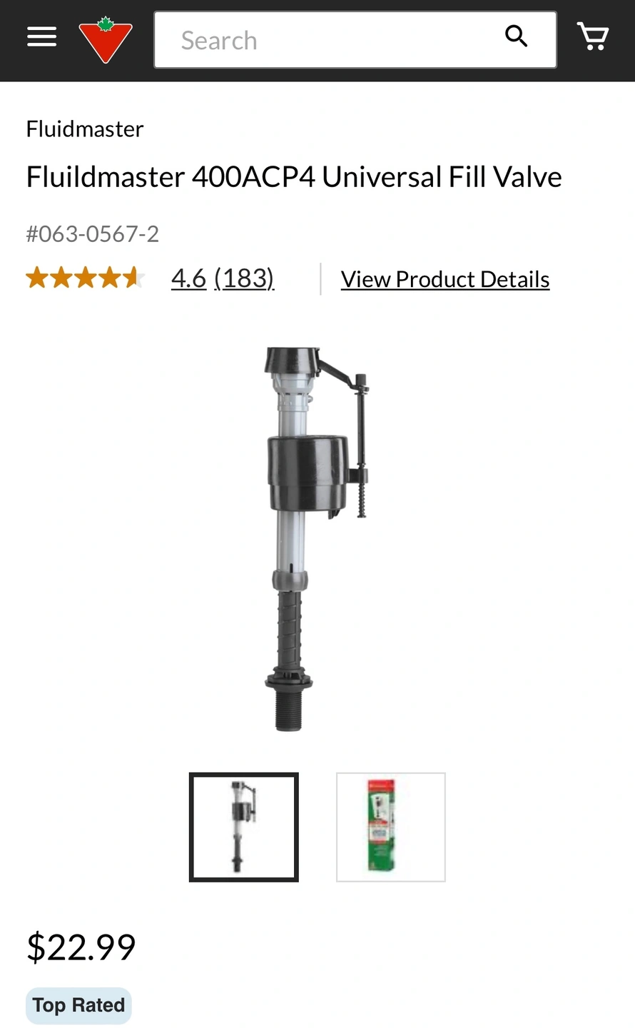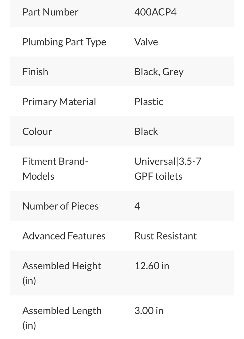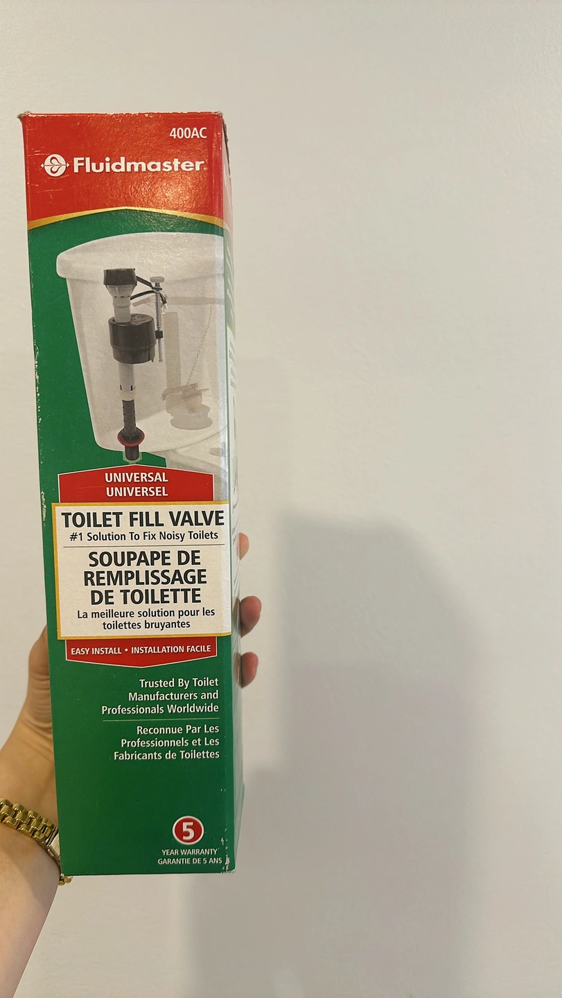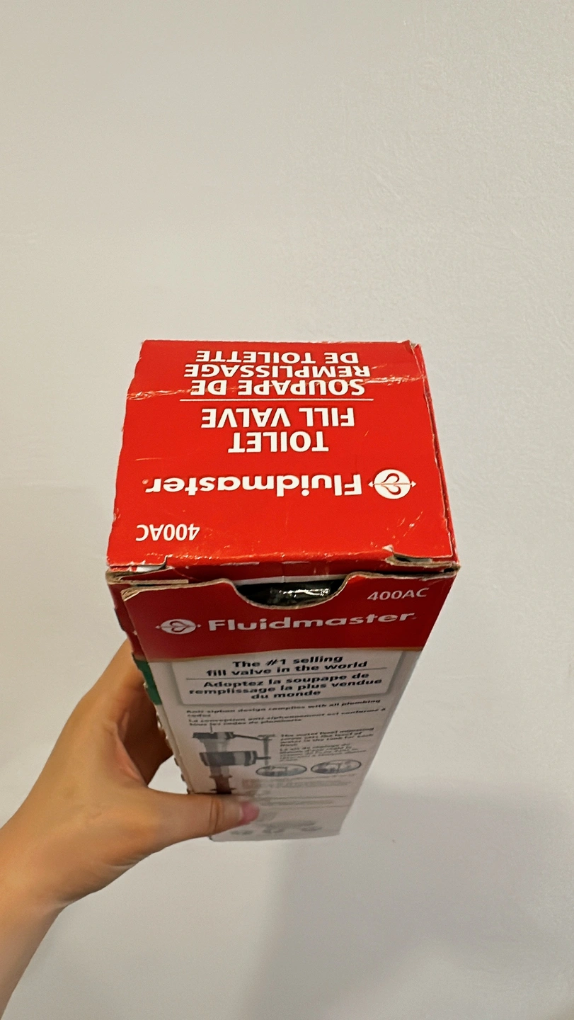 This is a toilet fill valve by Fluidmaster. This is an anti-siphon design-fill valve with adjustable height from 9″ to 14″. It is a universal fit, easy to install, and it won’t contaminate the fresh water supply. It is best for use in 3.5 to 7 LPF toilets. EZ-Twist height adjusts from 9 (23 cm) to 14 (10 cm) to fit most tanks. Model number is 400ACP4. The box has been opened but the item has not been used. Retail price: $22.99 12.6x3.0”