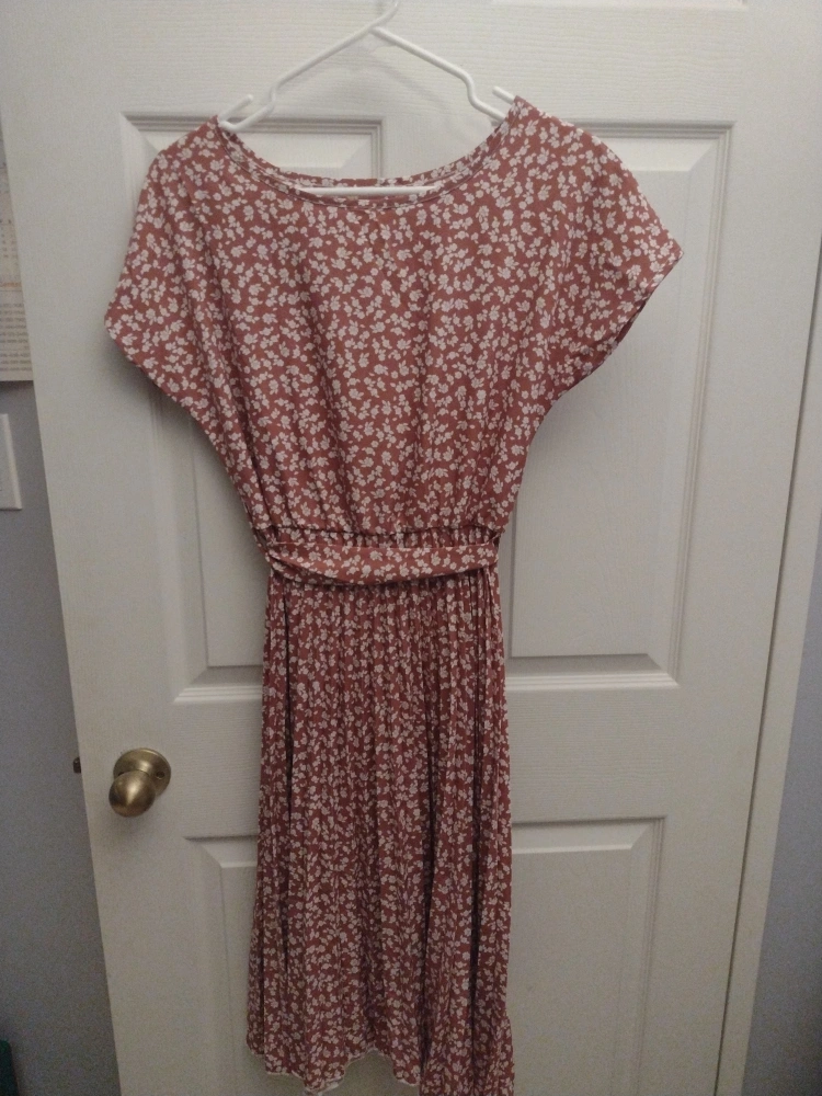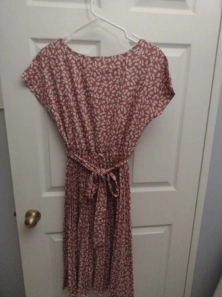 Floral dress not sure about brand. the size probably a small. silky feel comes with a cloth band to tighten dress of same color. semi garter waist band Perfect for the summer. it is in good condition total length is 39 inches from top to bottom from waist down around 26 inches