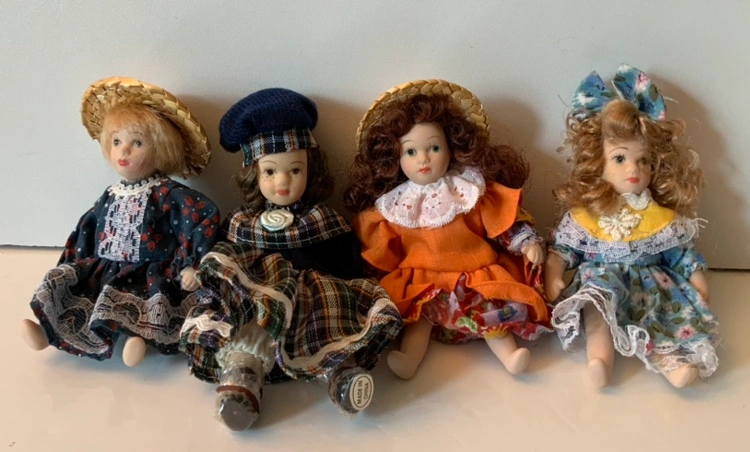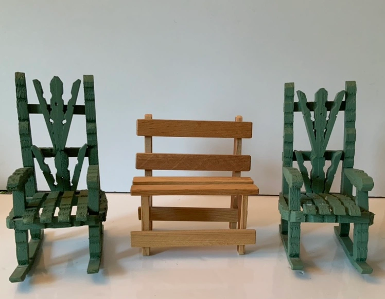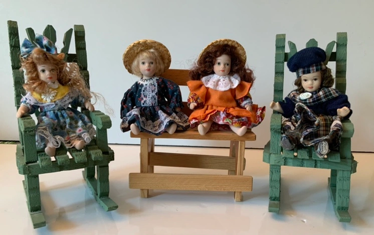 Miniature doll rocking chair – handmade – 7x3 1/2 inch. Green $20 each. Miniature handmaid, doll bench –wood-5 x 5 $20 Miniature ceramic dolls Each $5
