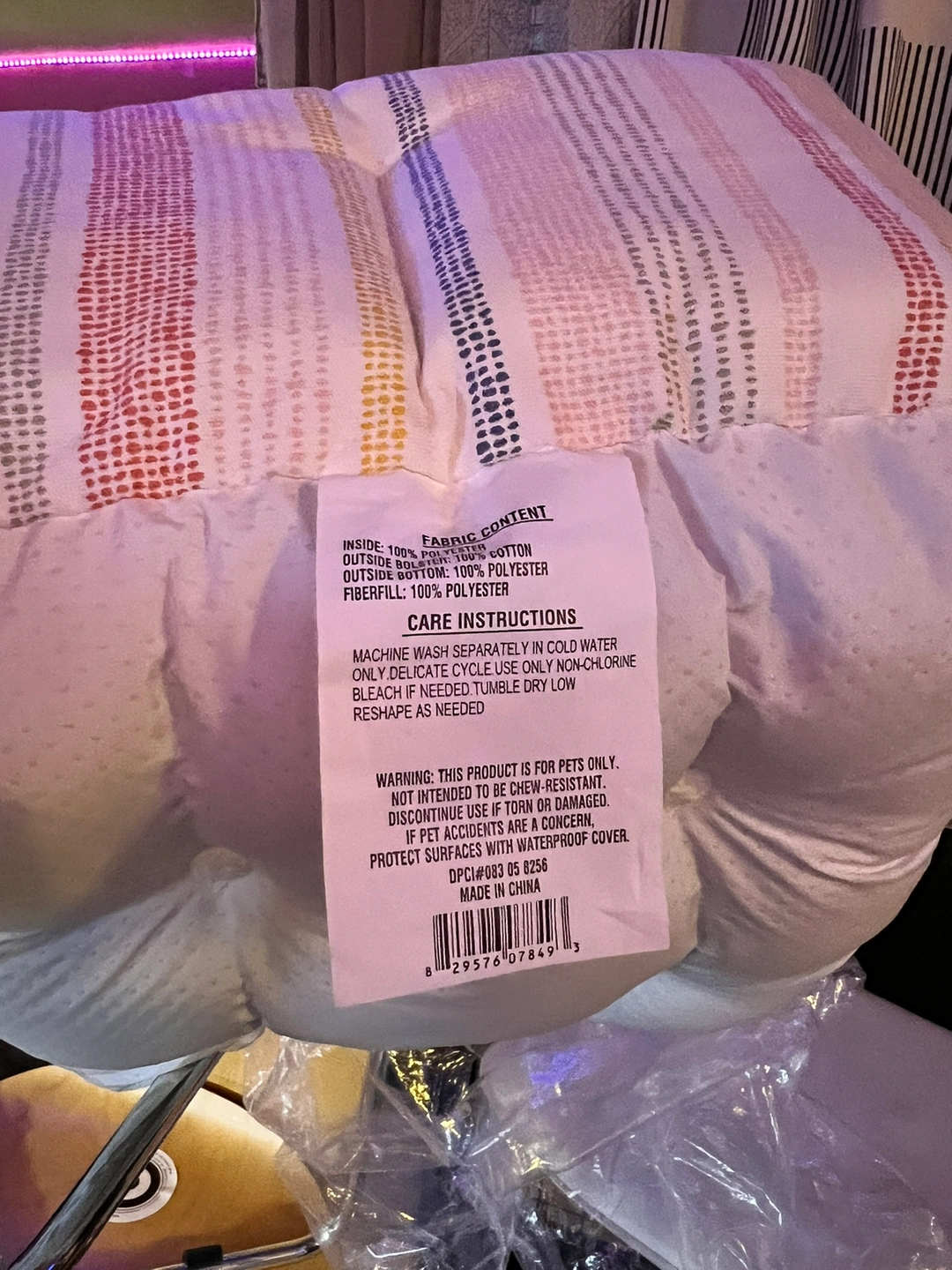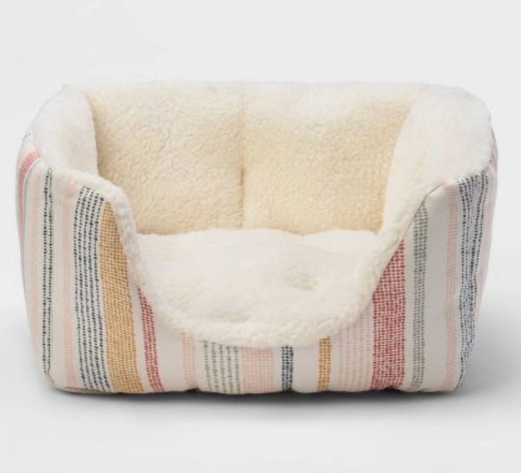 *High-walled bolster bed provides your pet with a comfy sleeping space. *Comes with high-wall bolster design for a comfy sleeping experience. *Interior is lined with ultra-soft sherpa for a cozy place to rest. *Comes with a small cutout at the front for pets to easily enter and exit. Care Instructions: Machine wash separately in cold water only. Delicate cycle. Use only non-chlorine bleach if needed. Tumble dry low. Reshape as needed.
