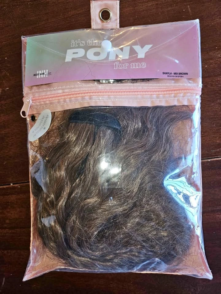 INH brand Ponytail synthetic vegan hair extention. My hair is too long so I can no longer use them! Smoke free pet free home- they do not smell and have been kept in their bags away from any exposure. Mixed brown 26" Heat resistant up to 320F I have other styles as well.