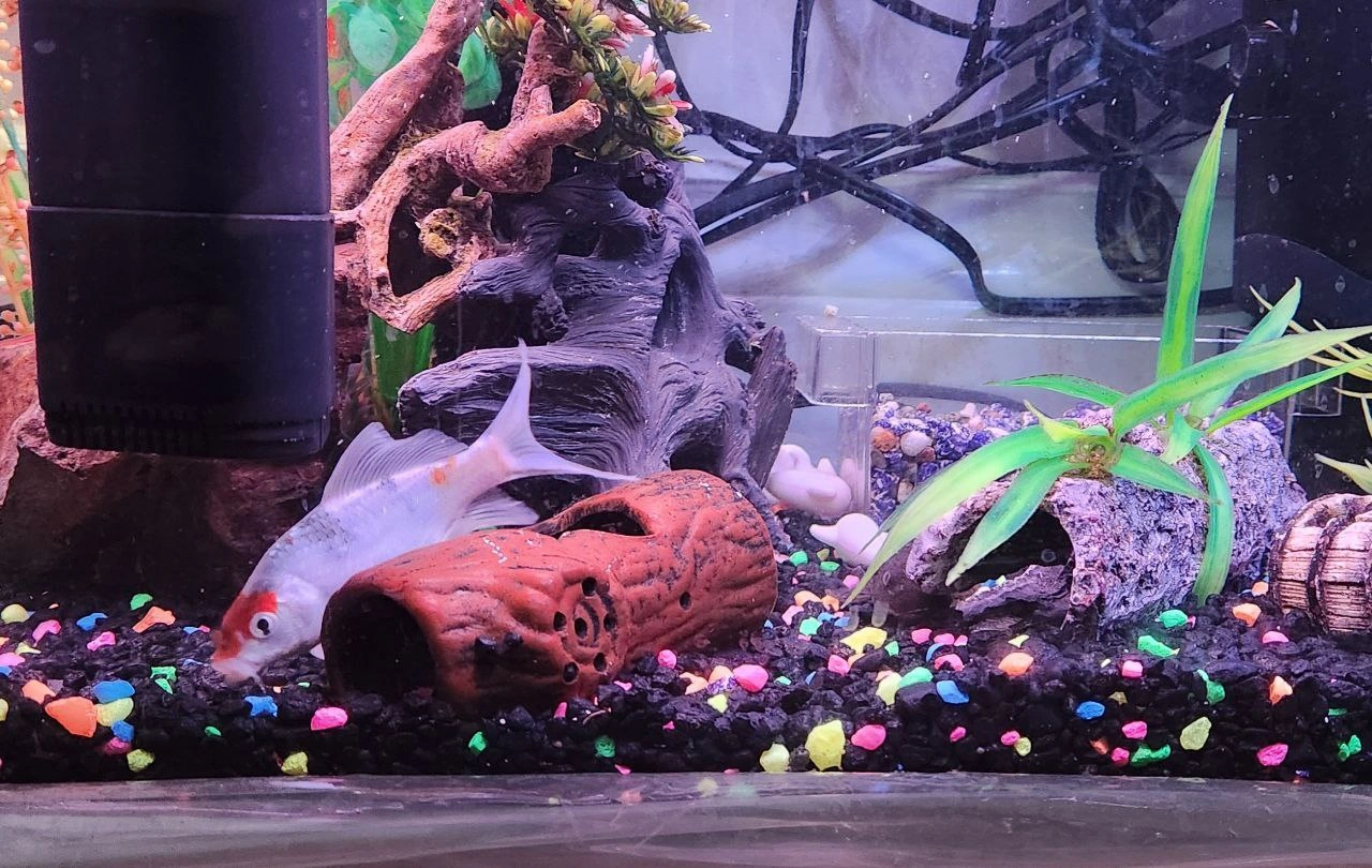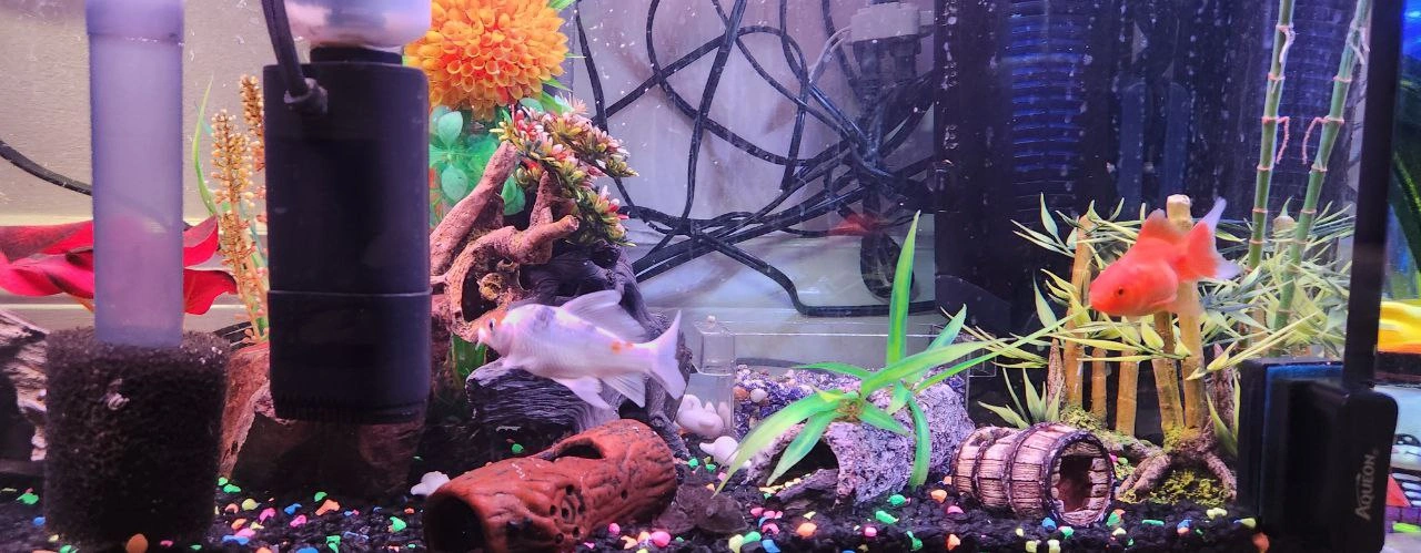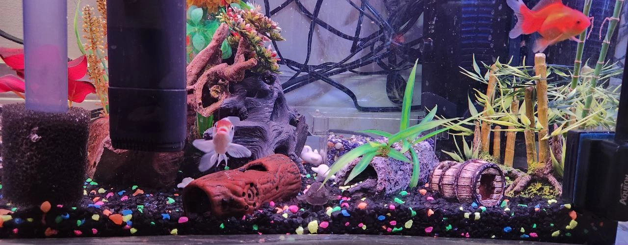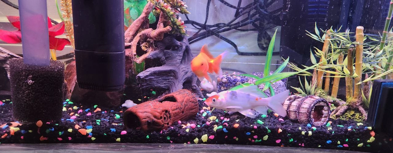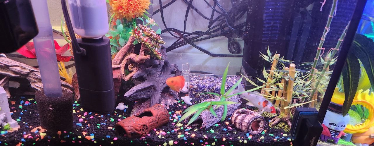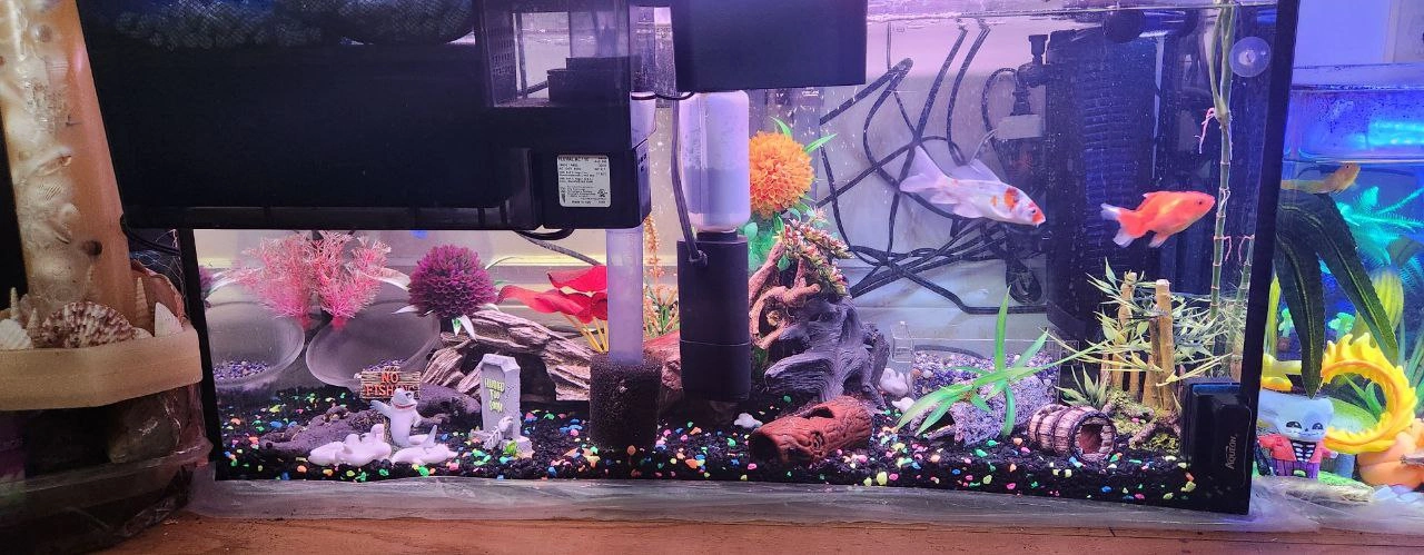 Dimensions: 32x12x16 glass aquarium may include filter, pumps, heater, lighting, decorations, rocks, etc. (everything you will need for a successful home/office aquarium) Currently the aquarium has a happy colony set of Gold fishes, koi fishes and Algae eaters in different colours and sizes and the aquarium setup is more geared towards a high pH environment (pH 7 or higher). (Gravel, rocks are coral) A medium well size aquarium. If you are a hobbyist looking to get an aquarium setup with everything you need for a reasonable price this is a great way to get started. With the powerful lighting and coral rock and gravel, this aquarium is easily converted to a marine aquarium