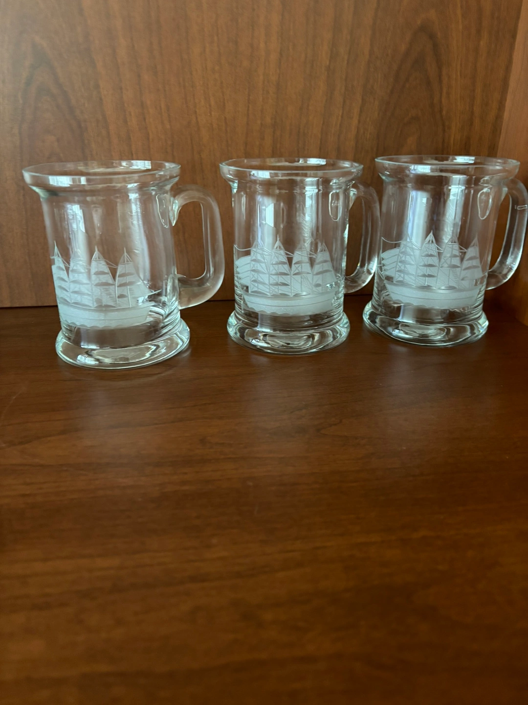 Vintage, never used, perfect condition glass mugs. Brand is Toscany. Solid glass base and handle with an etched schooner on one side. $25 is for the 3 Holds 15 oz liquid. 4.75” tall x 3.75” wide at the top. Pickup 2 km N of Hwy 401 & Weston Rd. (Weston & Sheppard) North York. Cash only, No Holds Thanks