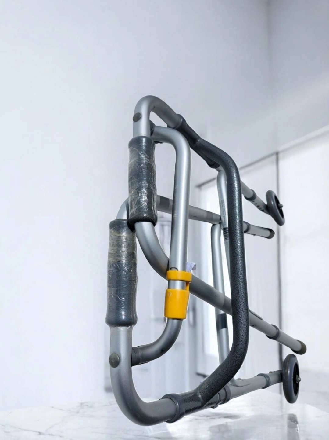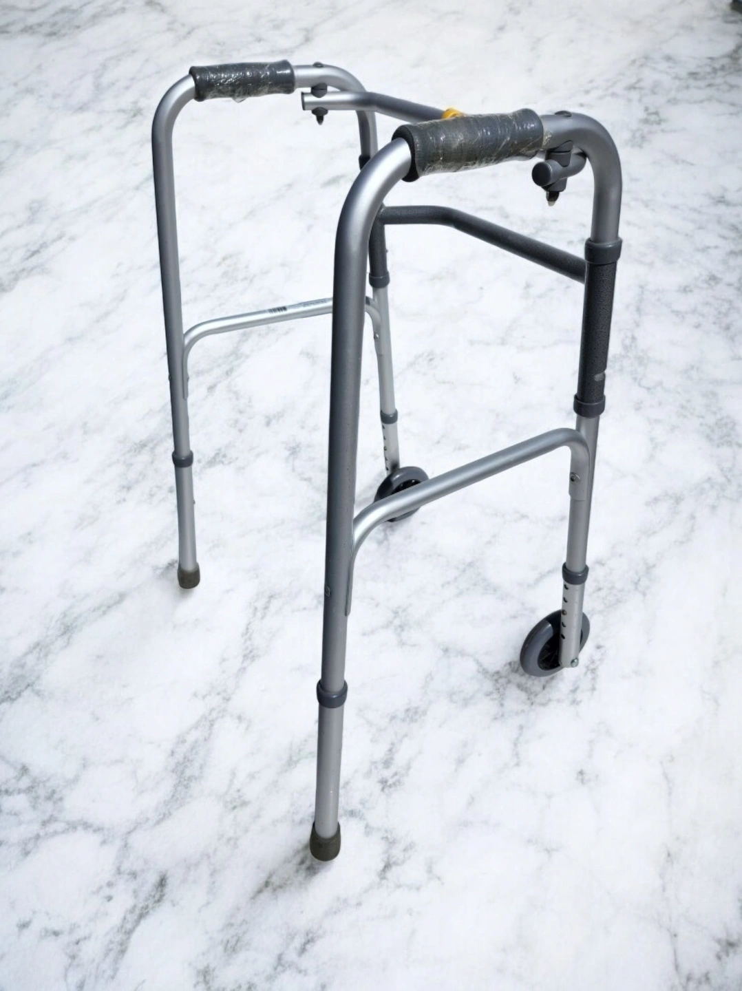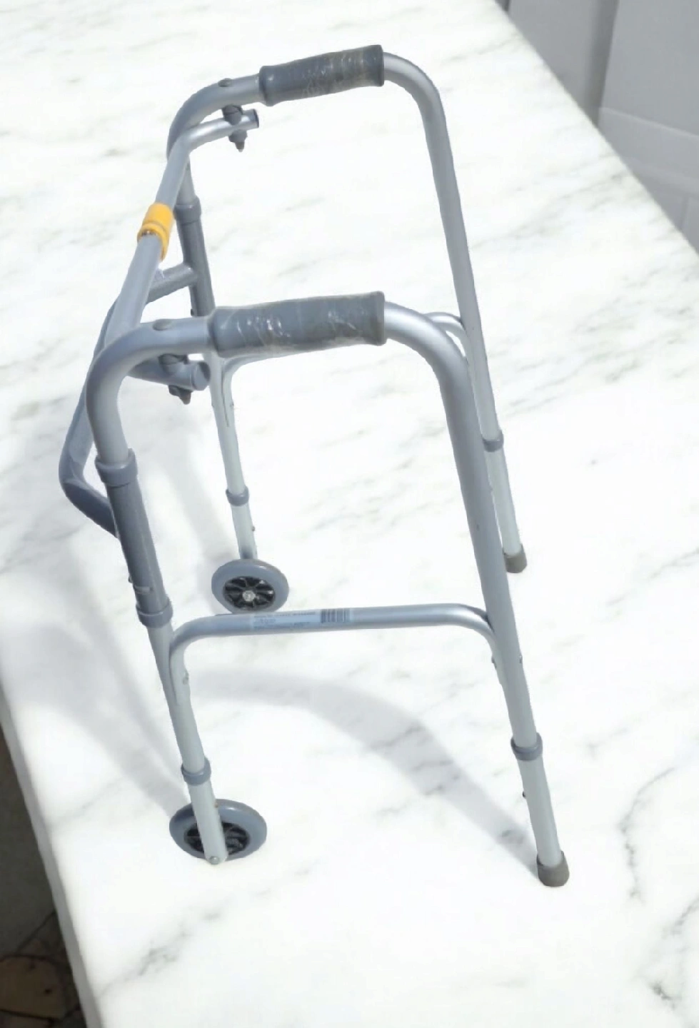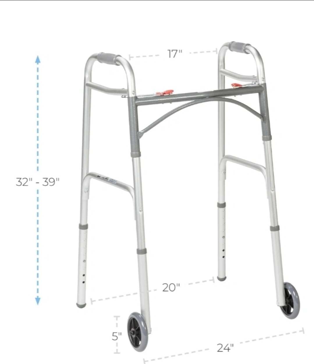 Comes with wheels and a vinyl contoured hand grip retail we pay few month a go $75 Each side operates independently to allow easy movement through narrow spaces and greater stability while standing Easy push-button mechanisms may be operated by fingers, palms or side of hand Newly designed rear glide cap allows for walker to slide easily and smoothly over most surfaces Sturdy 1 inch diameter aluminum construction ensures maximum strength while remaining lightweight