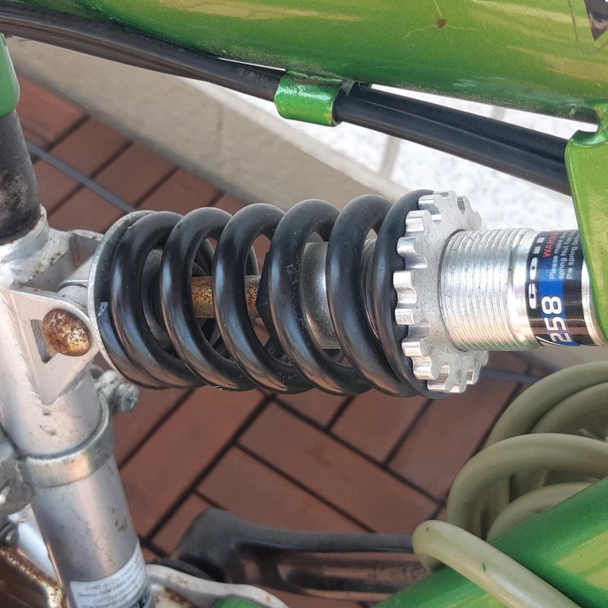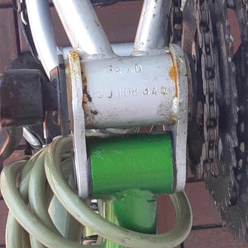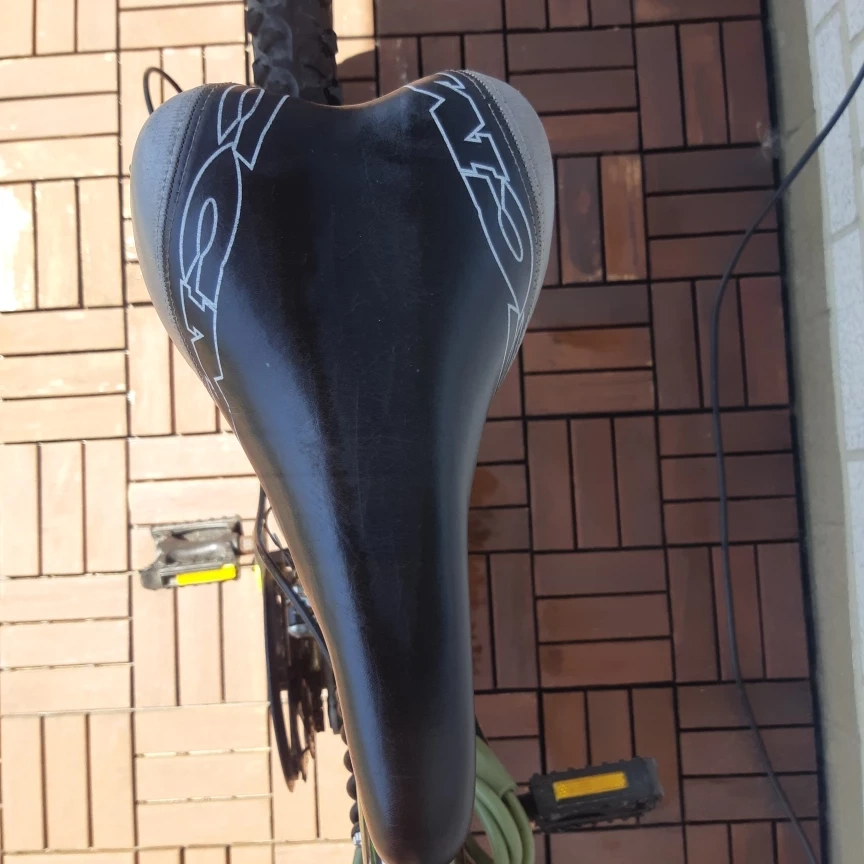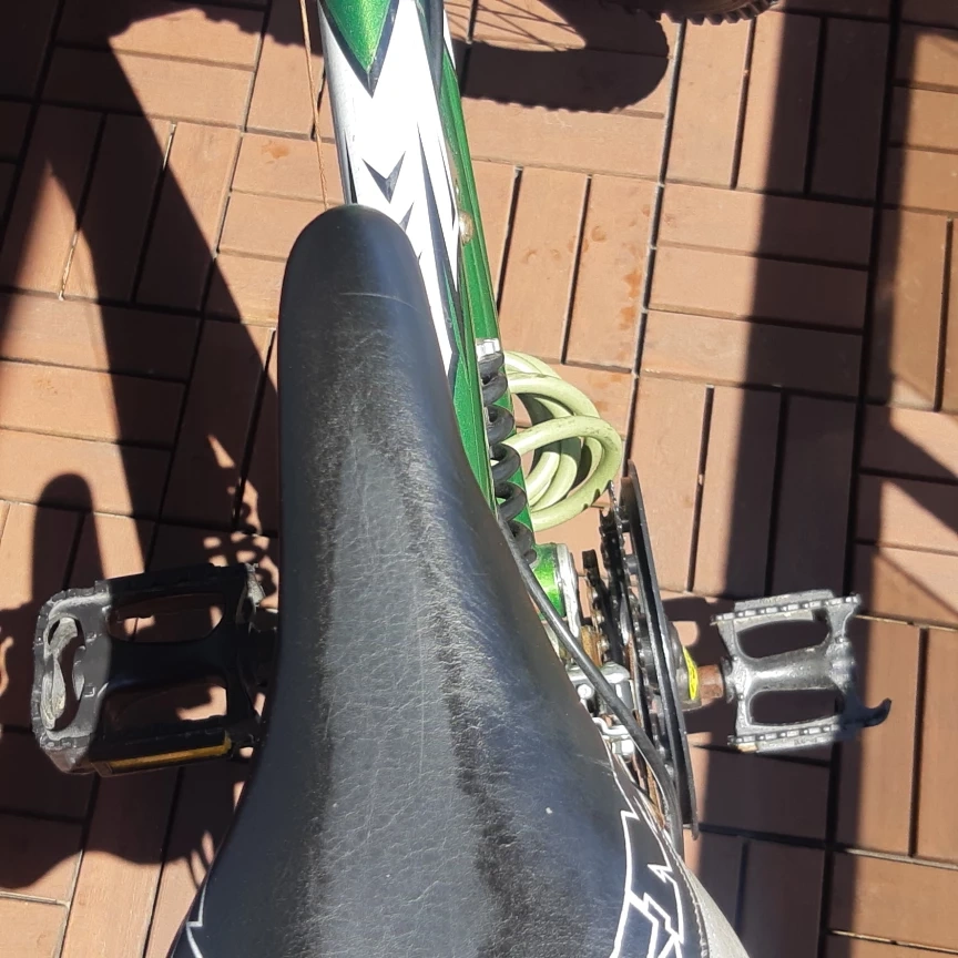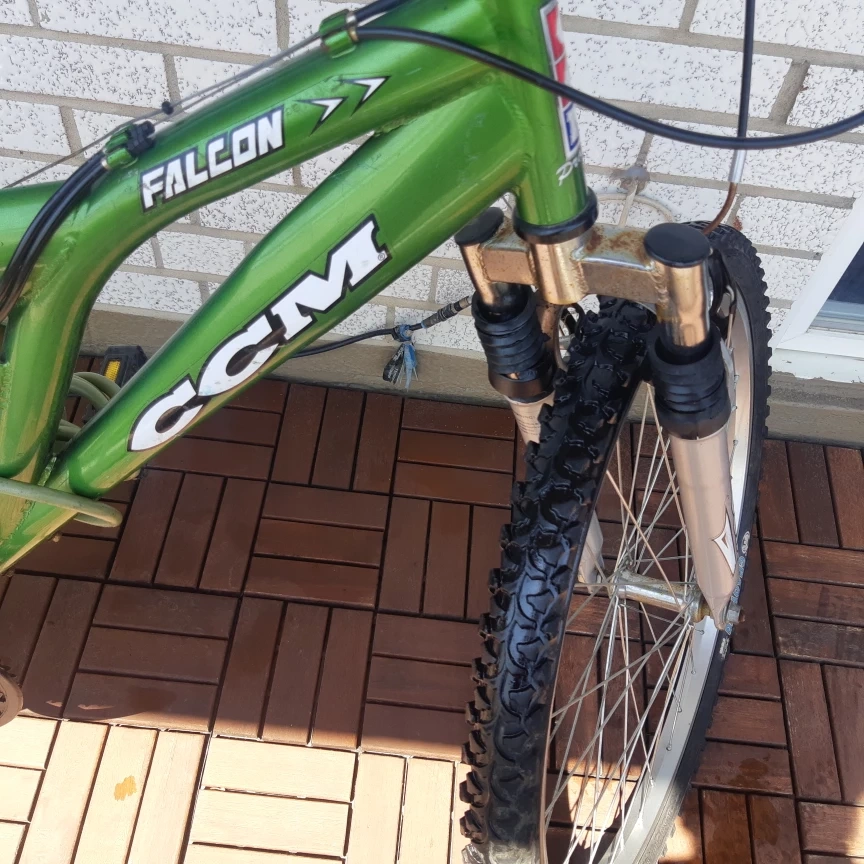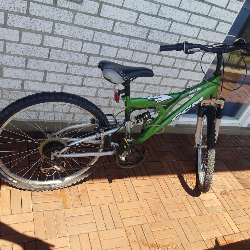 Green Mountain Bike. Has front suspension. Has a rear shock. Includes pedals. 12 speed, CCM Falcon