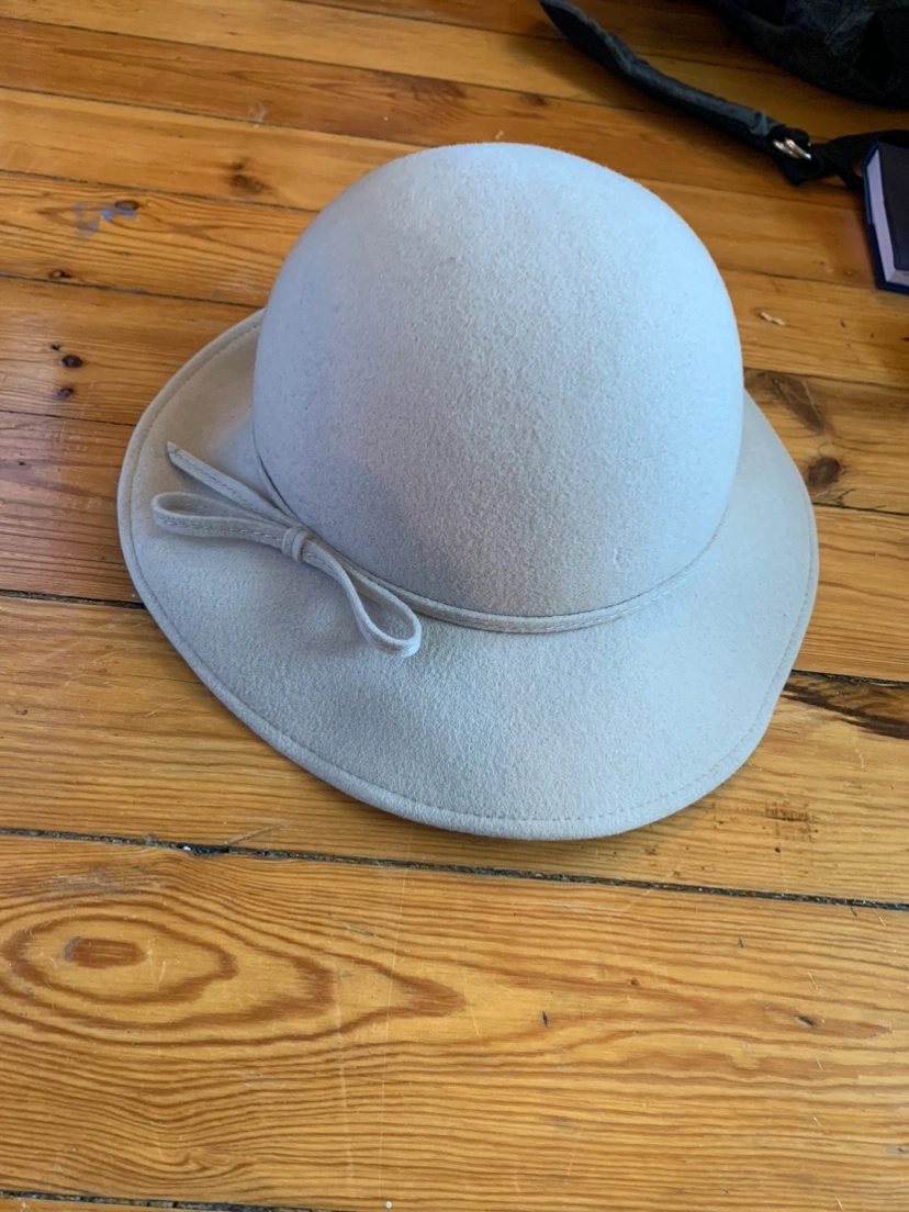 Light beige felt hat, can shape the rim slightly as it’s lined with thin wire.