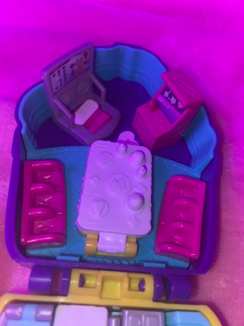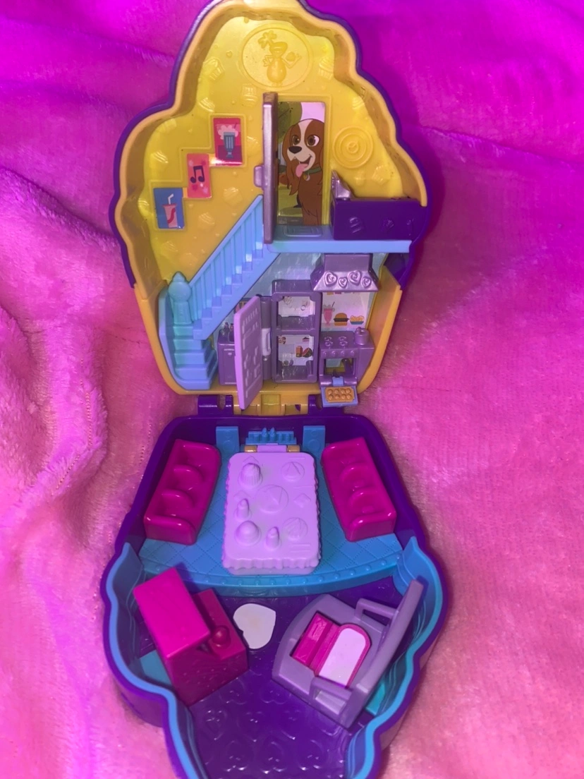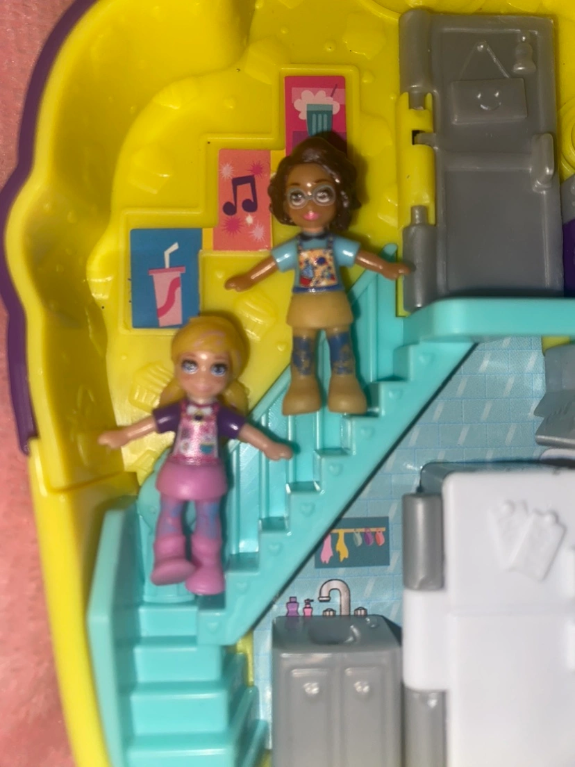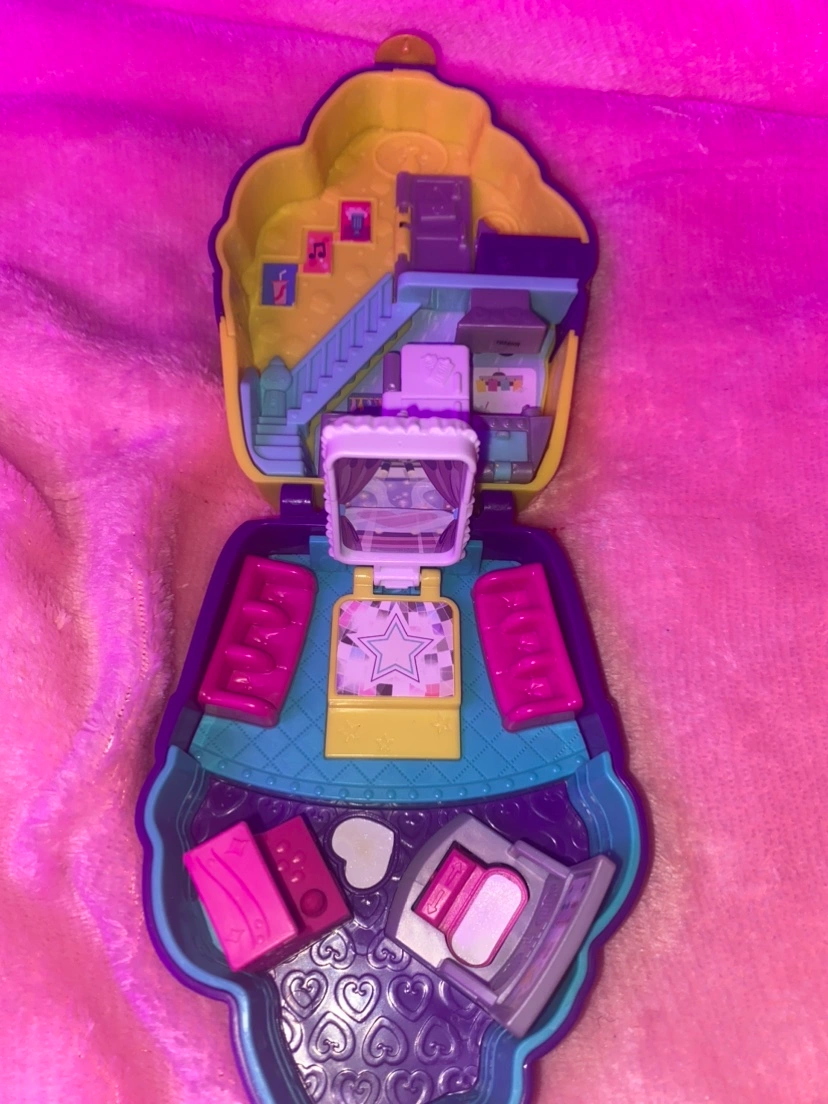 Polly Pocket Playset Comes with two dolls, be used. They sticky material type polly’s but no longer stick anymore. They’re plastic tiny dolls but waist down are rubber material. Playset is in a compact purple cupcake shape. It’s a micro playset so the dolls very tiny and playset fits adult hand. Easy to open and close playset. It’s a cafe on top and an arcade type. Check condition in photographs, i believe it’s great besides the micro dolls. Smoke Free & Pet Free Household. Pick Up Only, No Delivery. Cash Only. Only reach out if interested in purchasing the item. Do not waste my time.