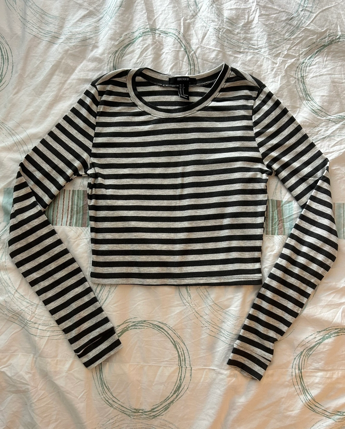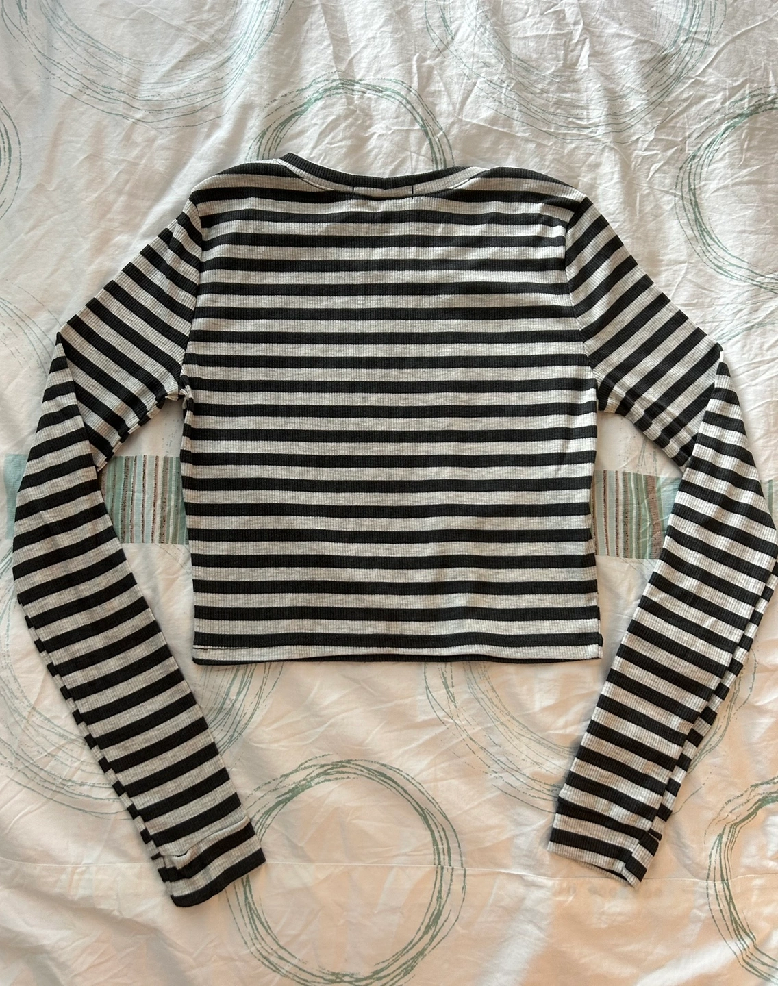 Black and gray striped long sleeve crop top. Has a round neckline and ribbed material. It's a bit on the small end.