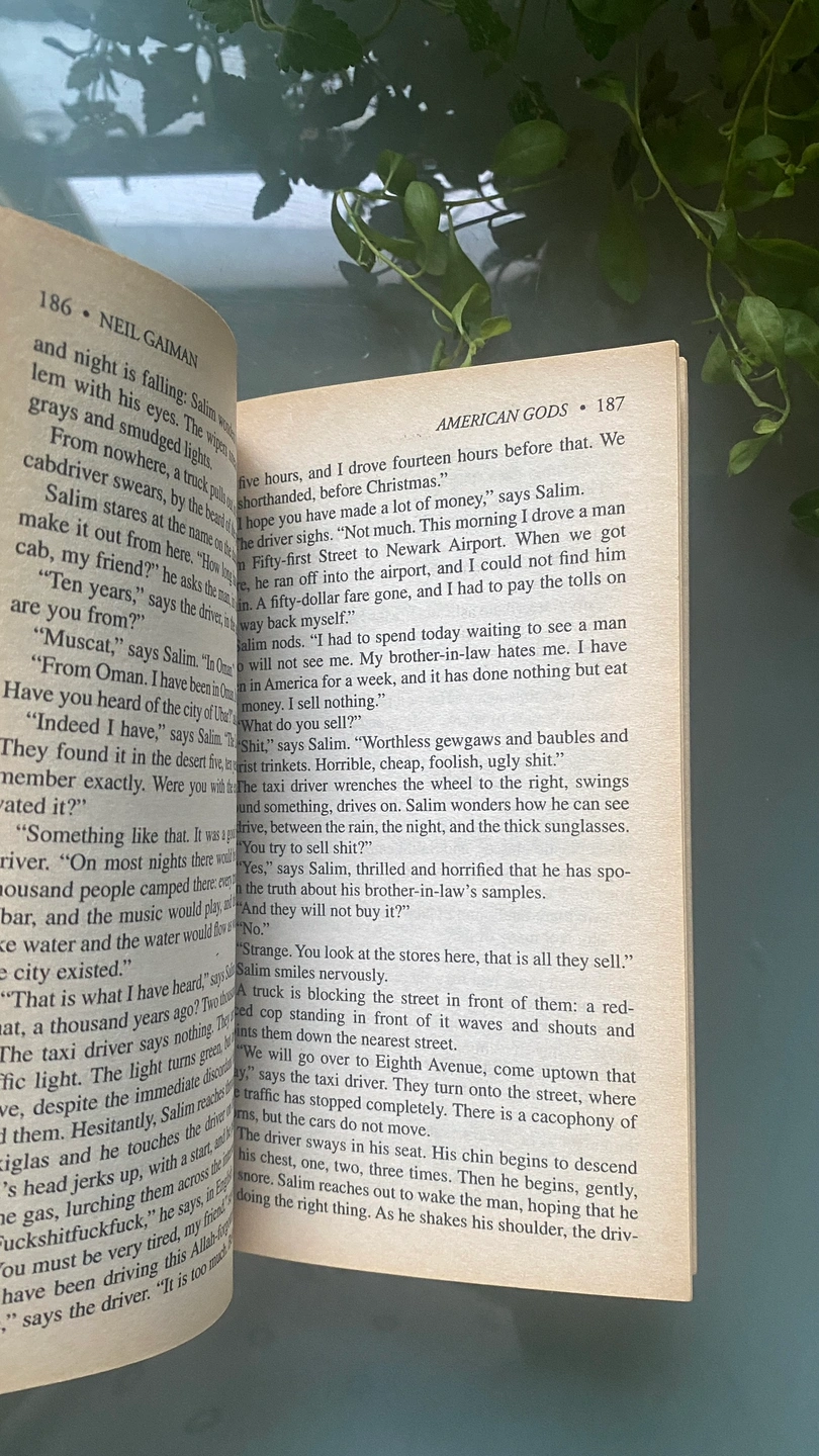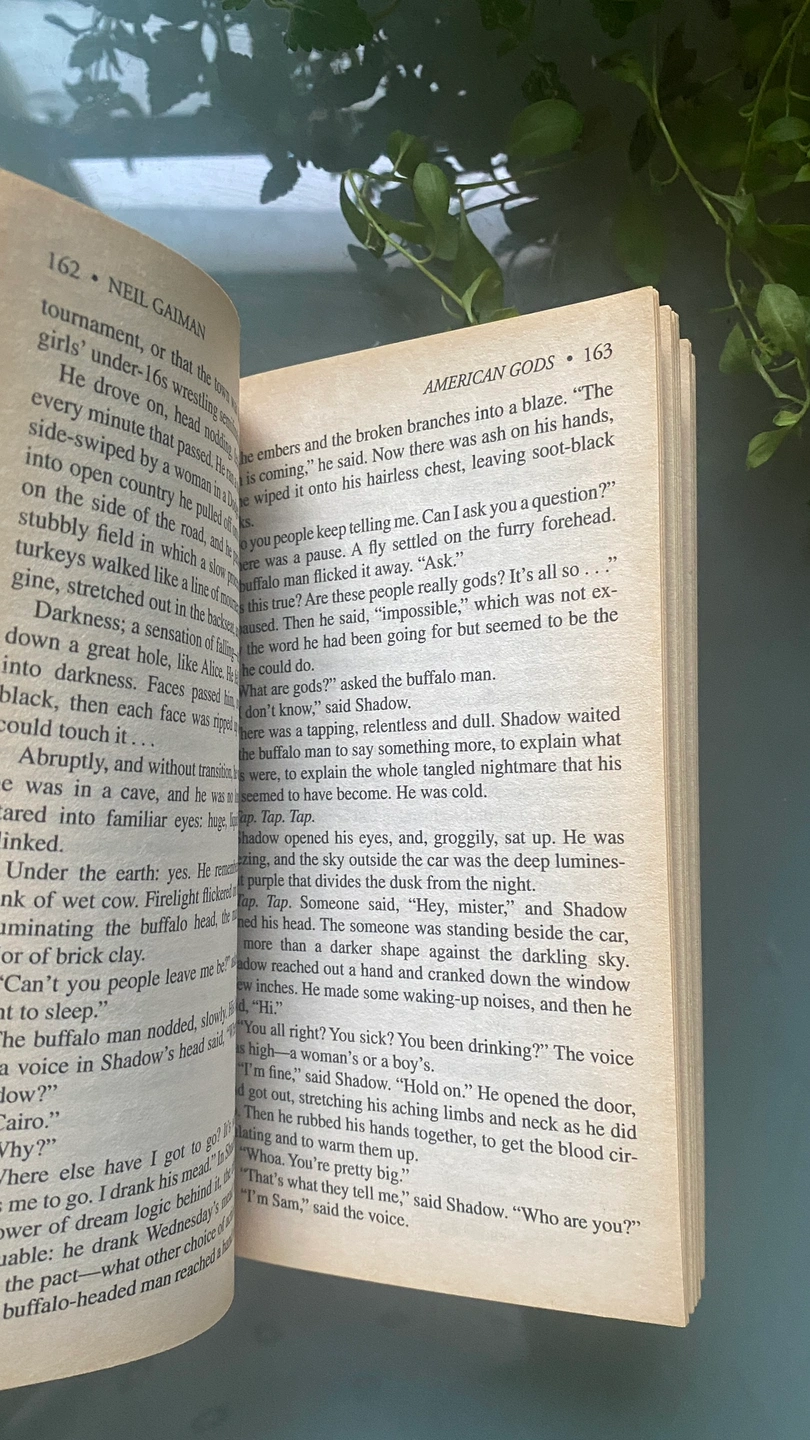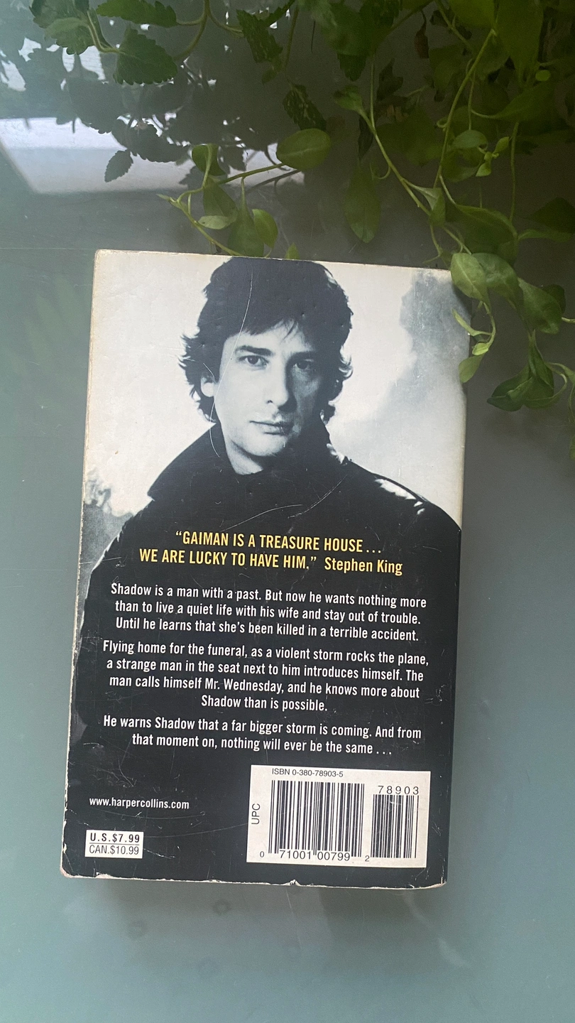 Shadow is a man with a past. But now he wants nothing more than to live a quiet life with his wife and stay out of trouble. Until he learns that she's been killed in a terrible accident. Flying home for the funeral, as a violent storm rocks the plane, a strange man in the seat next to him introduces himself. The man calls himself Mr. Wednesday, and he knows more about Shadow than is possible. He warns Shadow that a far bigger storm is coming. And from that moment on, nothing will ever he the same... *There is a TV show that was shot in Toronto on this book.*