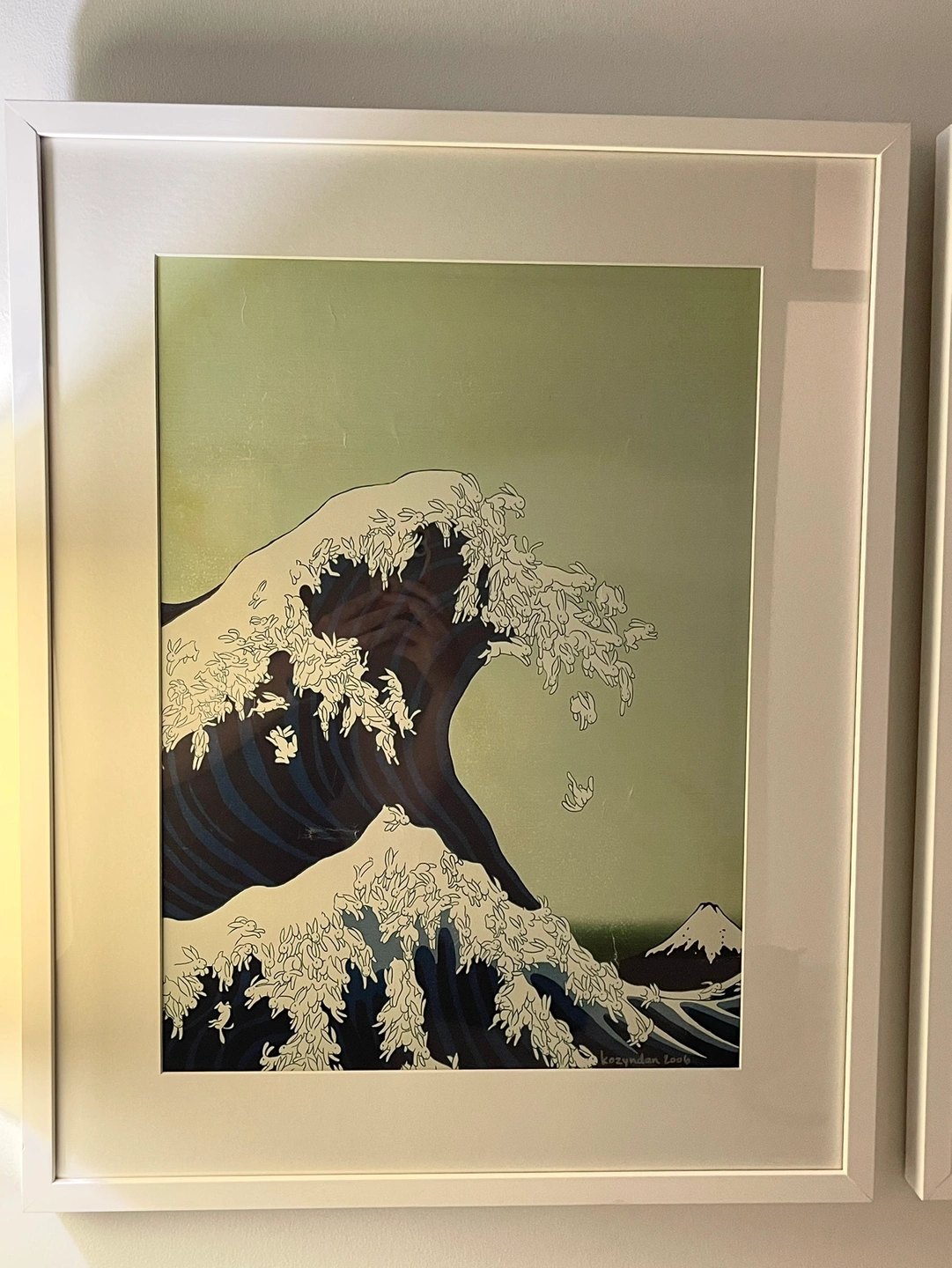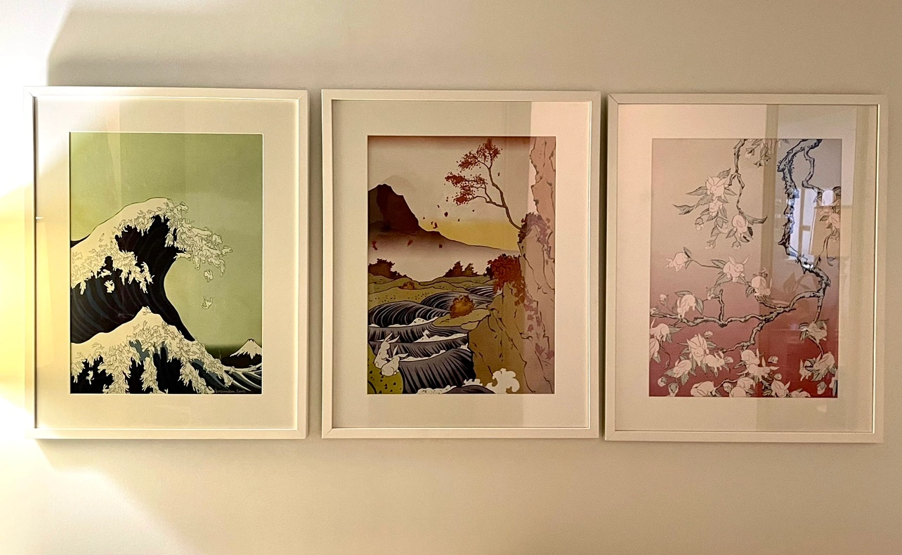 Kozyndan are a husband and wife team on multidisciplinary artists who work in drawing, sculpture and photography. Their work has been exhibited all over the world and they have done album covers for Weezer, Usher, and others. The Seasons of the Bunnies series began in 2003, and the wave image, “Uprising” was created for the cover of Giant Robot magazine. In 2006 they had a show at the now (sadly) closed pop gallery Magic Pony on Queen St West. These prints were purchased at that show and two of three are signed. They are printed high quality on 80#cover stock by the artists and sold through that show. Print measures 16.5x22 inches and has been professionally mounted, matted and framed in white wood frames at Artsense in Calgary. Finished size is 29”x23”. They are ready to hang and are perfect for your room or for a contemporary art look for a child’s room. I love them but am ready for a change. 1. uprisings, signed by the artist. The "Summer" image in the "The Seasons of the Bunny" series based on old Japanese ukiyo-e woodblock prints. This image was originally created for the cover of Giant Robot Magazine in 2003, and is, obviously, based on Hokusai's "The Great Wave off Kanagawa". 2. The Bunnies Fall. The "Autumn" image in the "The Seasons of the Bunny" series based on old Japanese ukiyo-e woodblock prints. 3. Bunny Blossoms, signed by the artist. The "spring" image in the "The Seasons of the Bunny" series based on old Japanese ukiyo-e woodblock prints. $600 for the set of three. Price is firm. Pick up is Queen St West at Dufferin.
