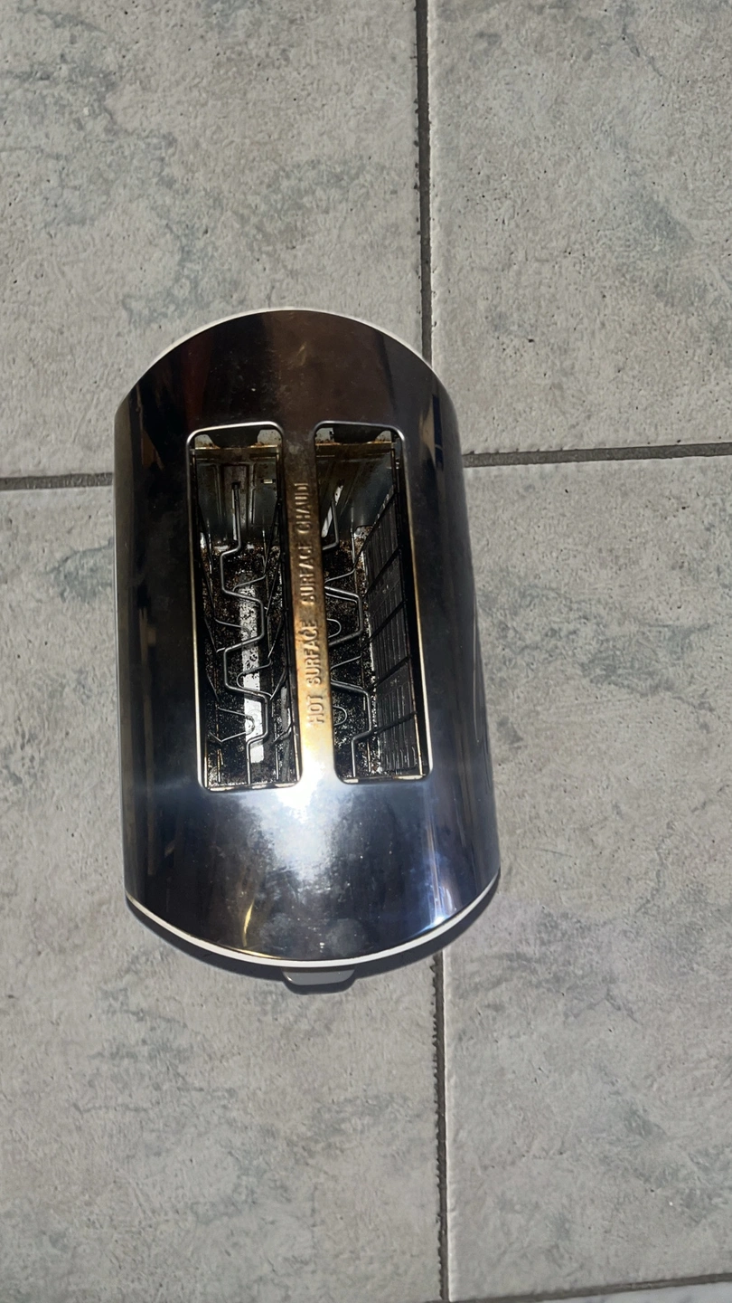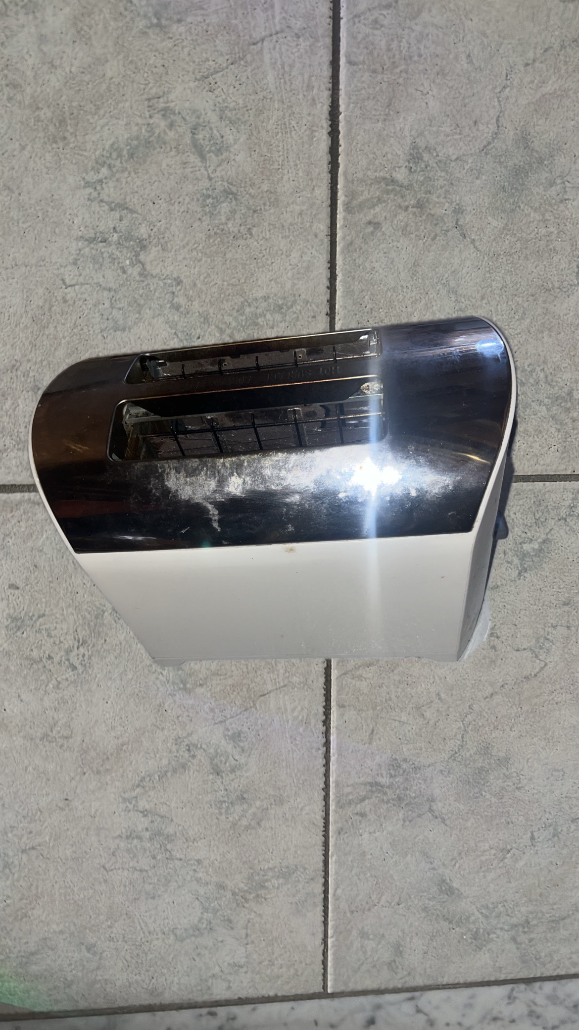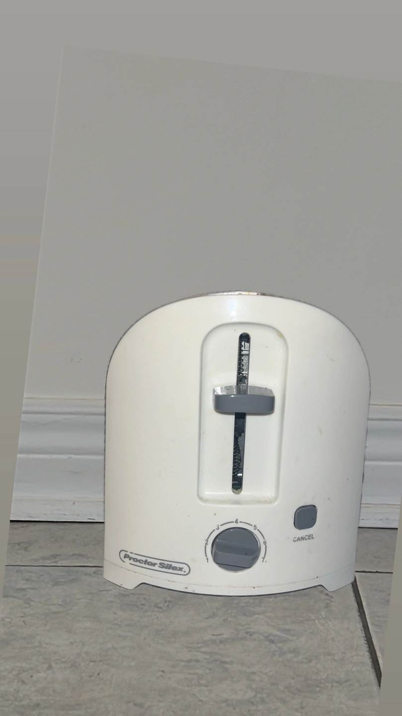 White toaster with a chrome top. It has a lever to lower the bread and a dial with settings for the darkness of toast. There is also a cancel button. It comes with a crumb tray. The toaster has two slots.