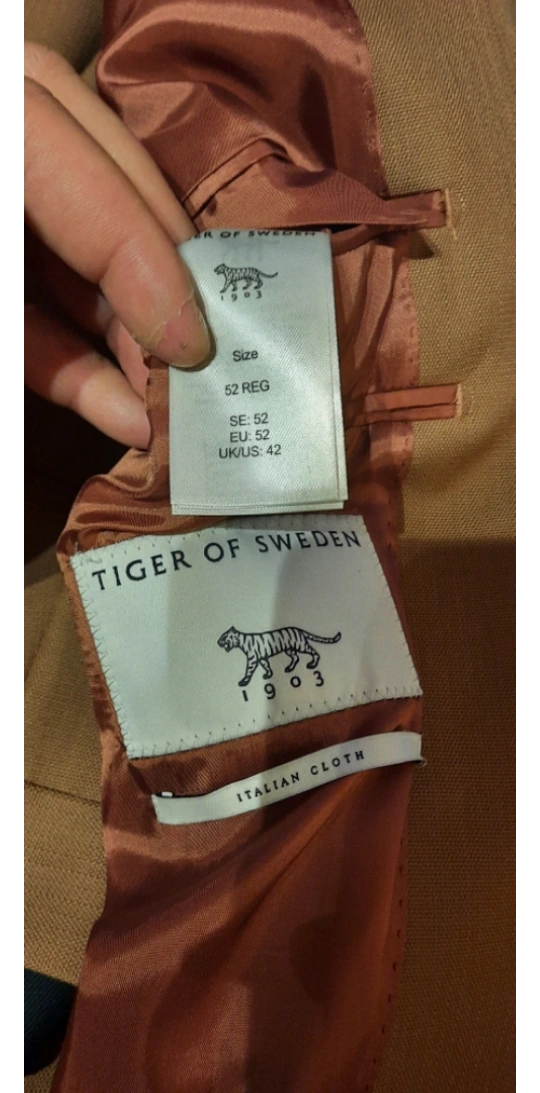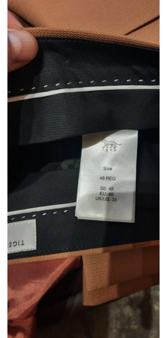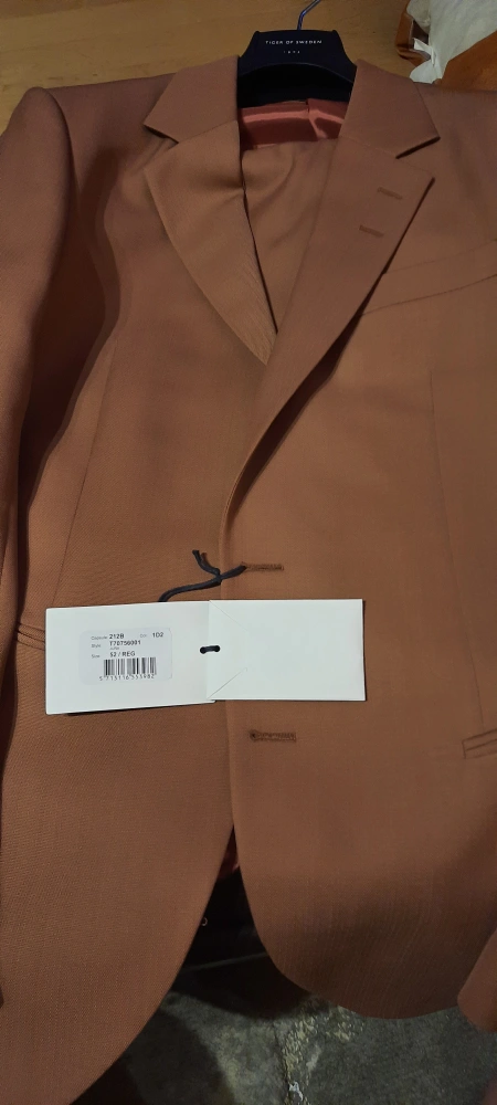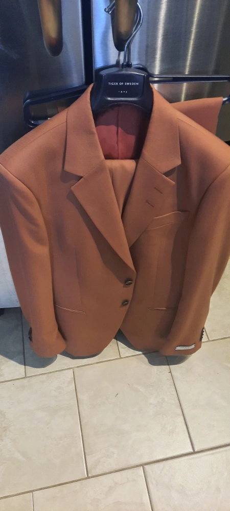 Gorgeous Brand New Blood Orange Tiger of Sweden Men's Suit. Tags are still on all 3 pieces of clothing. It comes with 2 pairs of pants! The jacket is a Euro 52 which is a large. It also has 2 pairs or pants just because I was in between sizes which is a 50 and a 48 Euro. It's also a slim fit! All of Tigers suits retail for $400+