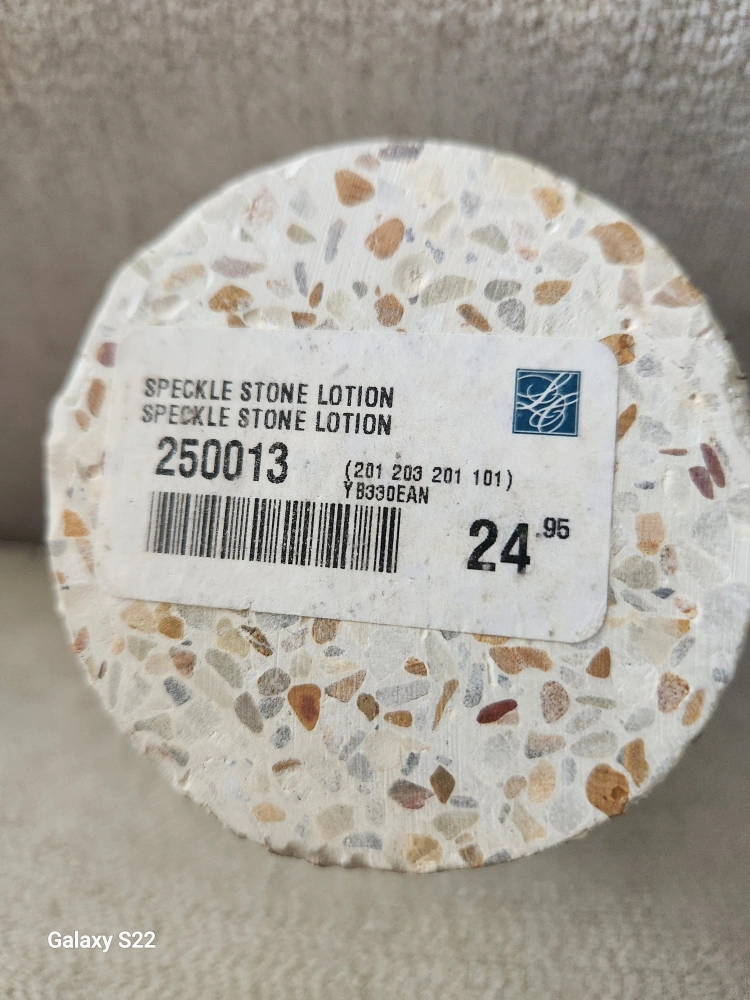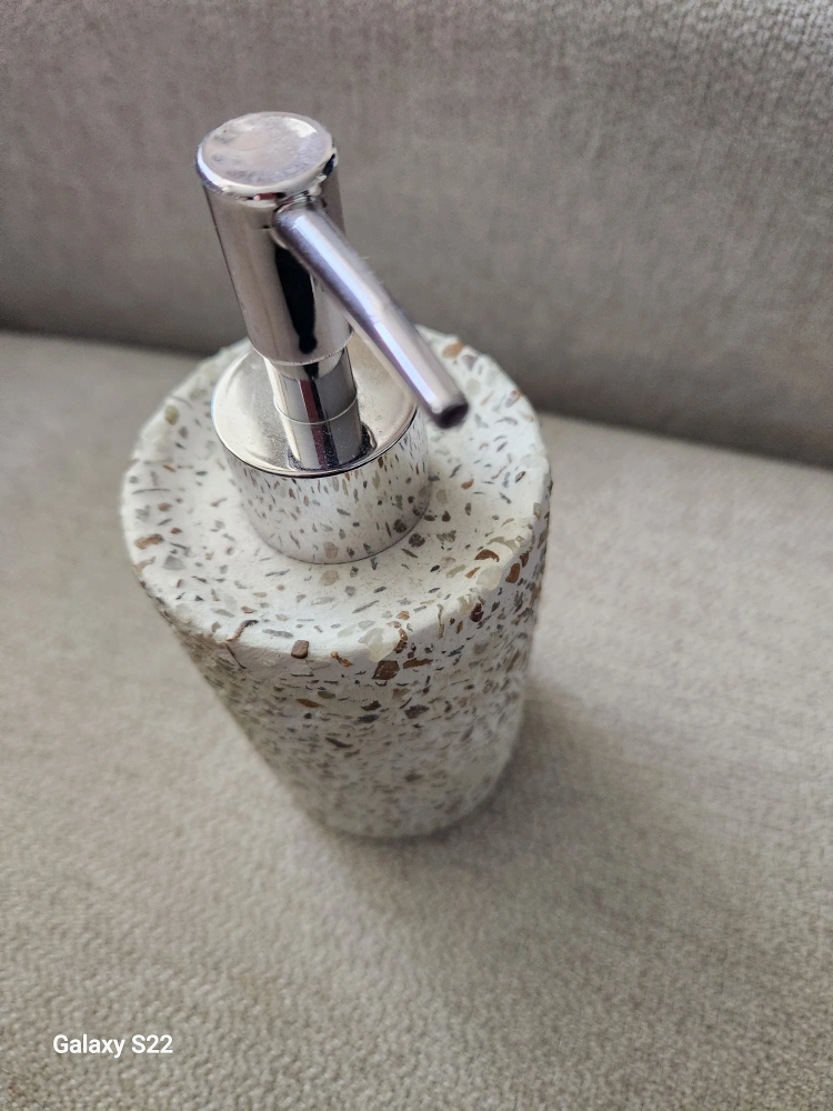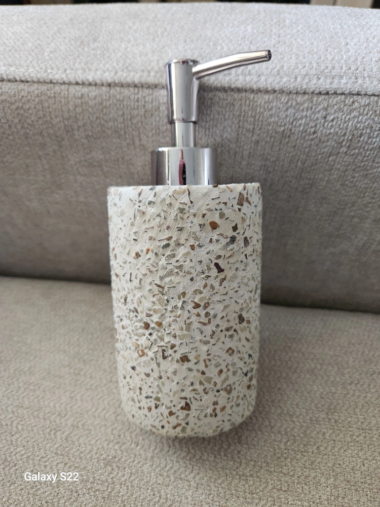 speckled stone handsoap/lotion dispenser. weighs about 3 pounds. maybe from Bed bath and Beyond. new. original price on bottom $26.99