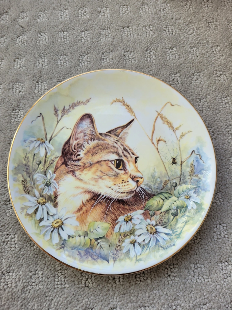 This plate is white with a picture of a cat's head and flowers painted on it. It has a gold trim.