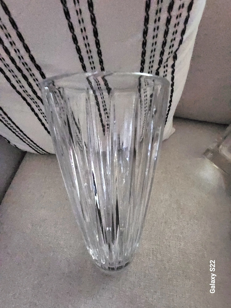 Mikasa Tall crystal glass vase with a ribbed design. The vase is approximately 12 inches tall. bottom sticker says Mikasa