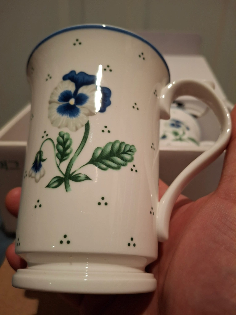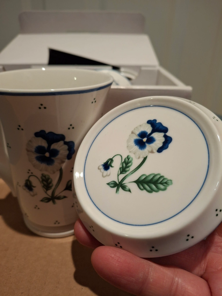 This is a set of 2 mugs and coasters with a blue pansy design. It is a line called Saint James by Hankook, made in Korea.